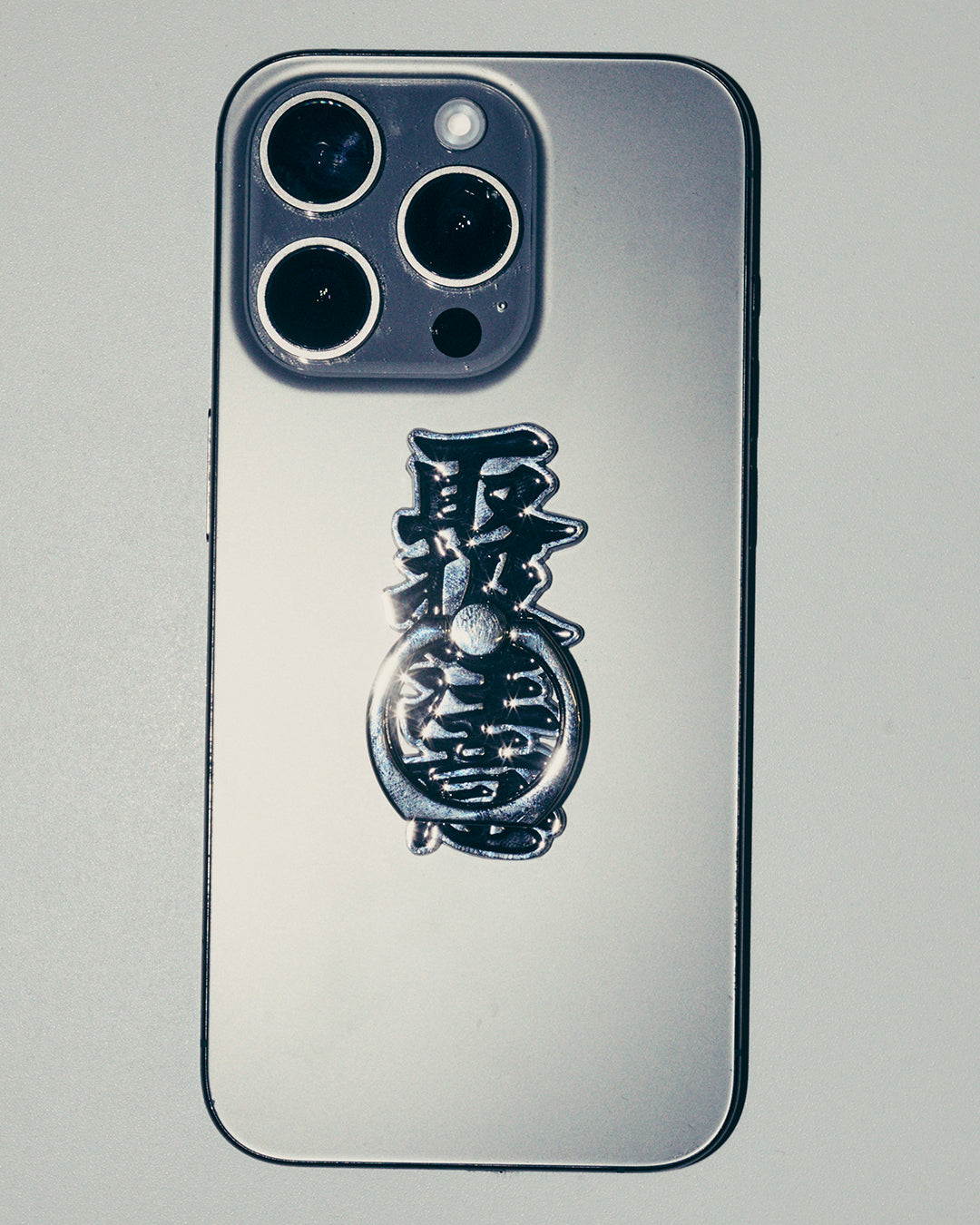 "取扱注意" のロゴを模ったスマートフォンリング。スマホ本体やケースに貼り付けて使う仕様。
