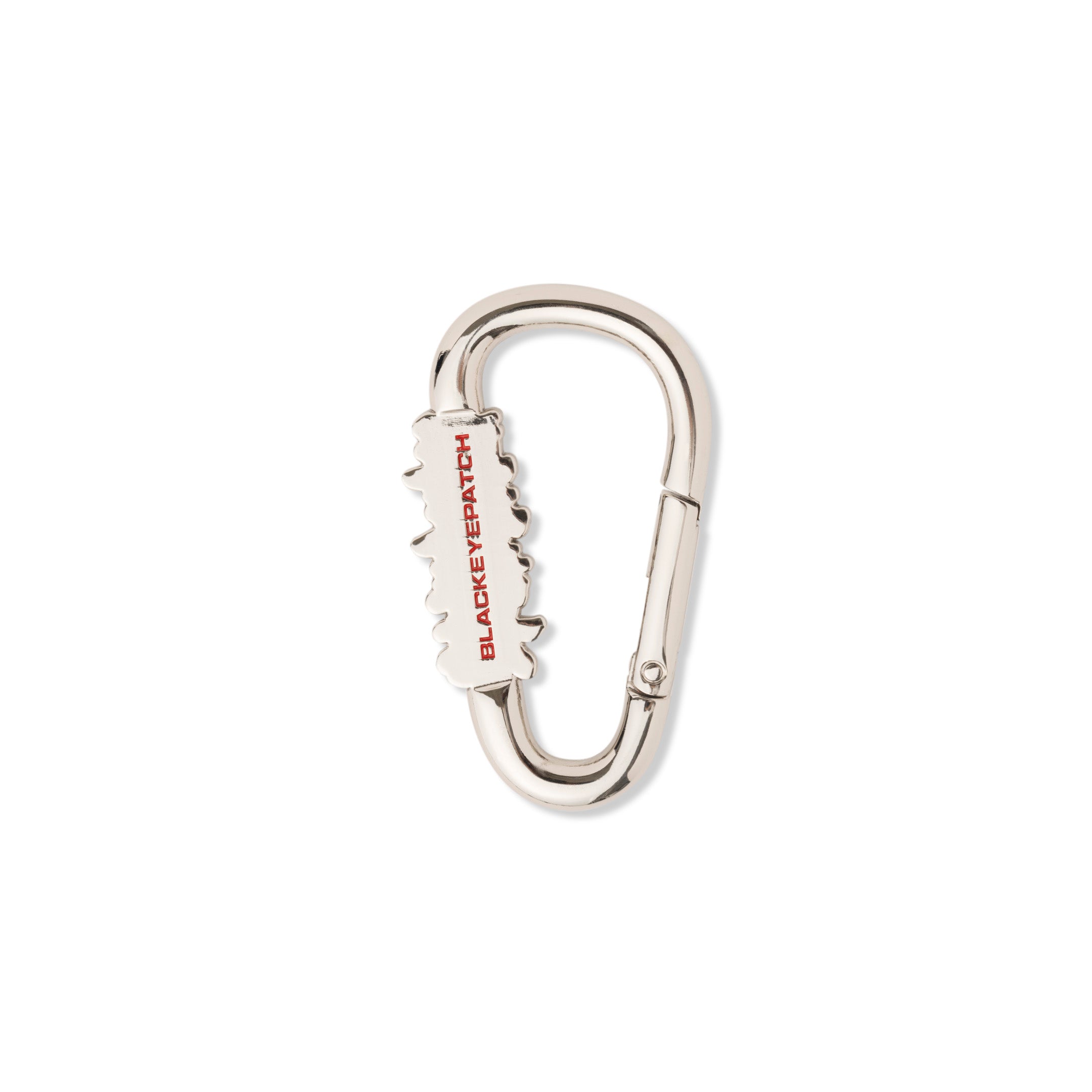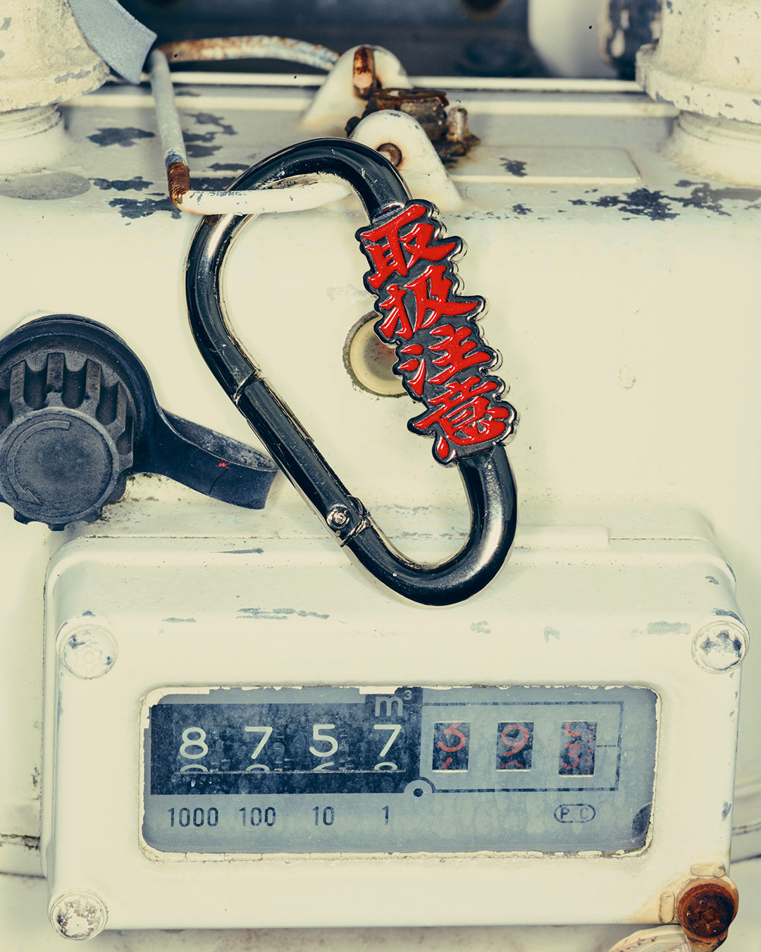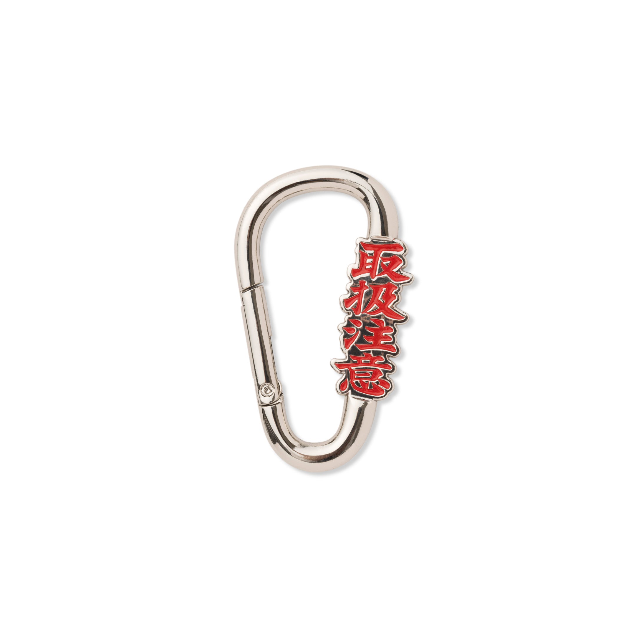 "取扱注意" の文字を立体的に象ったモチーフが入ったカラビナタイプのキーリング。シルバーに赤い配色のロゴが映える仕上がり。