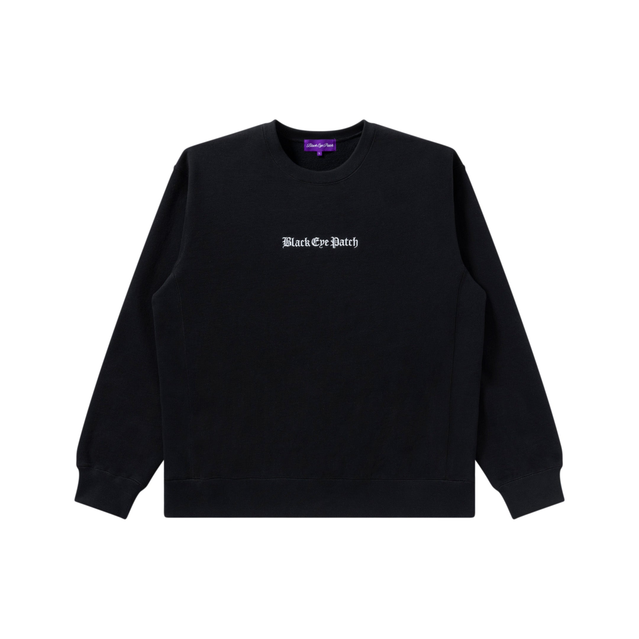 A 12.5 oz crewneck sweatshirt featuring embroidered Old English-style brand logo at the center of the chest.
