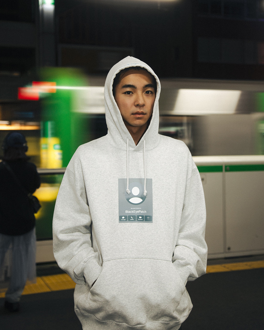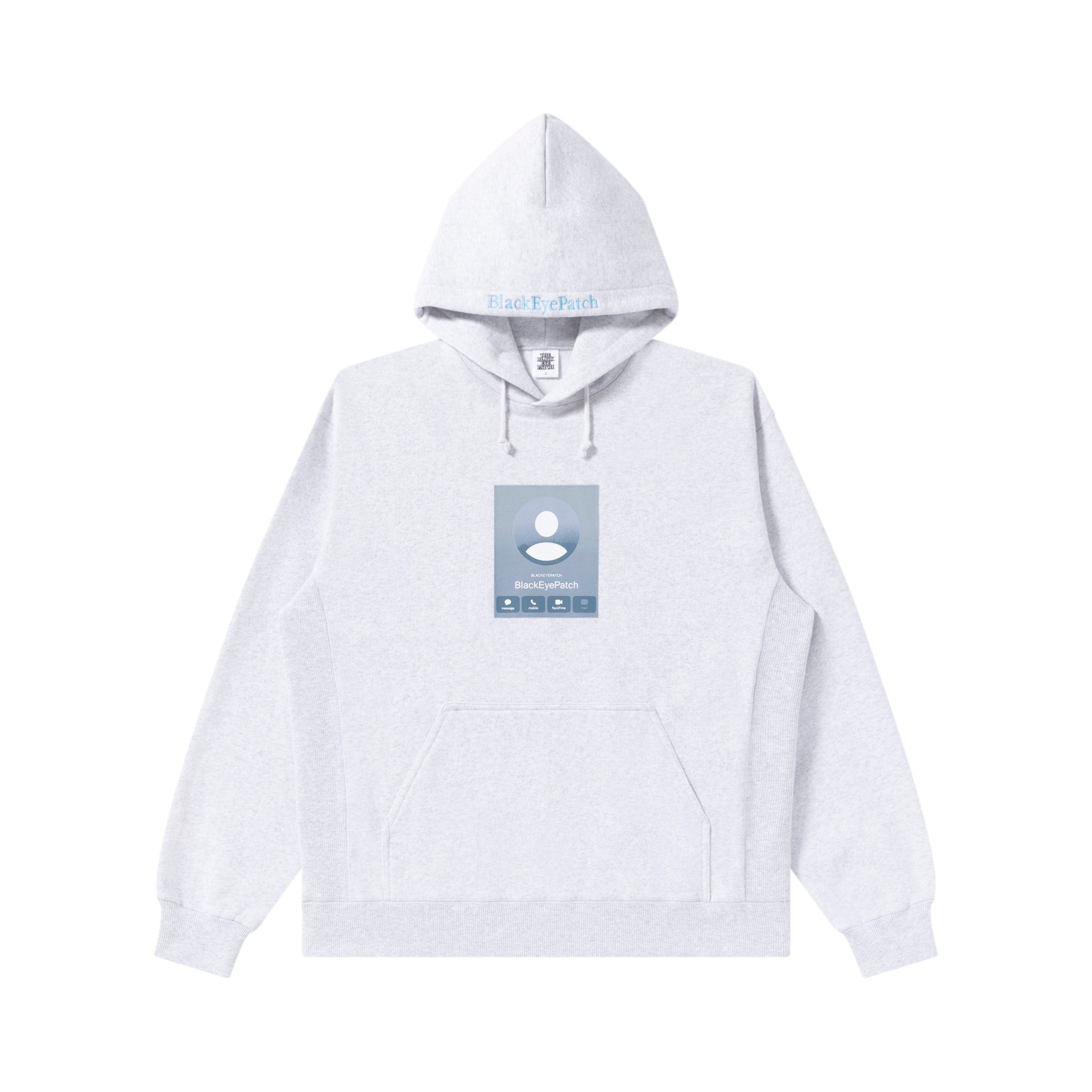 スマホのコンタクトインフォ画面をそのままグラフィック化して落とし込んだプルオーバーフーディ。