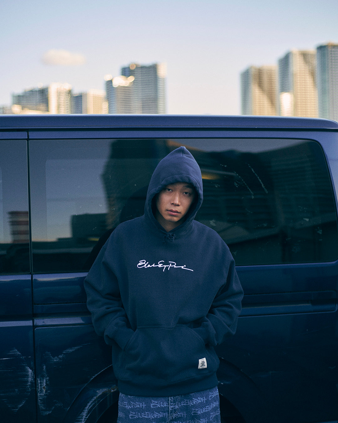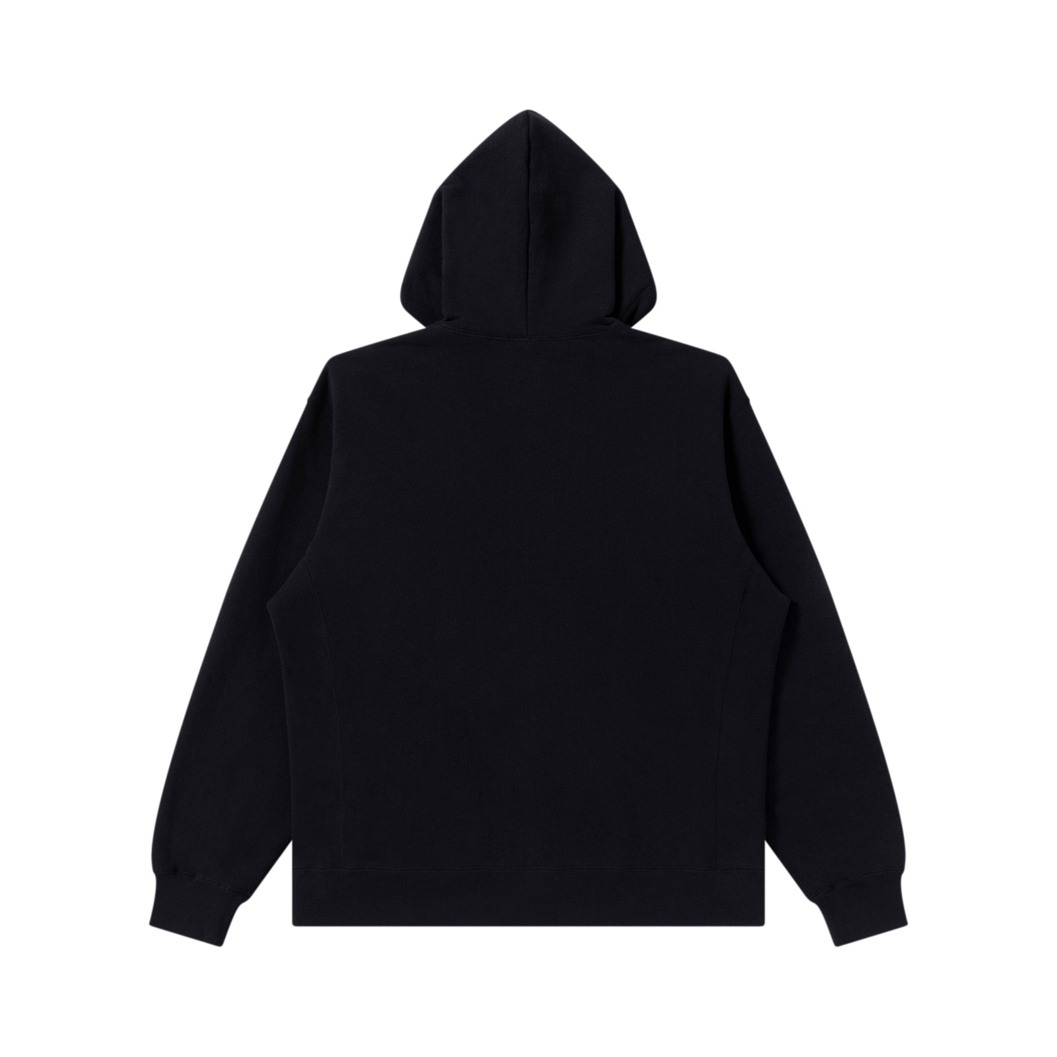 00 年代初頭の HIPHOP ギアブランドを彷彿させる手書きサイン調のロゴをフロントにウレタン入り刺繍で施したプルオーバーフーディ。