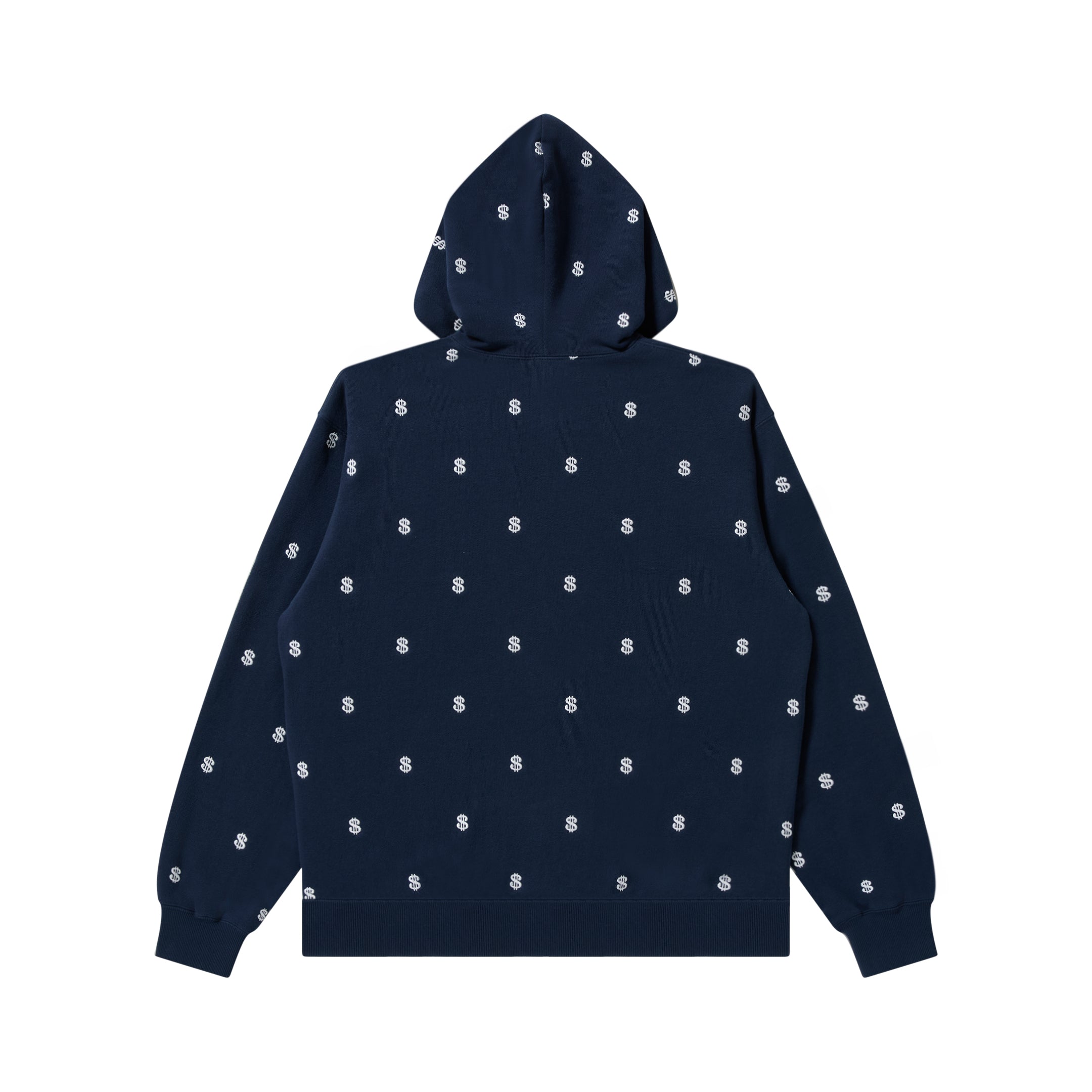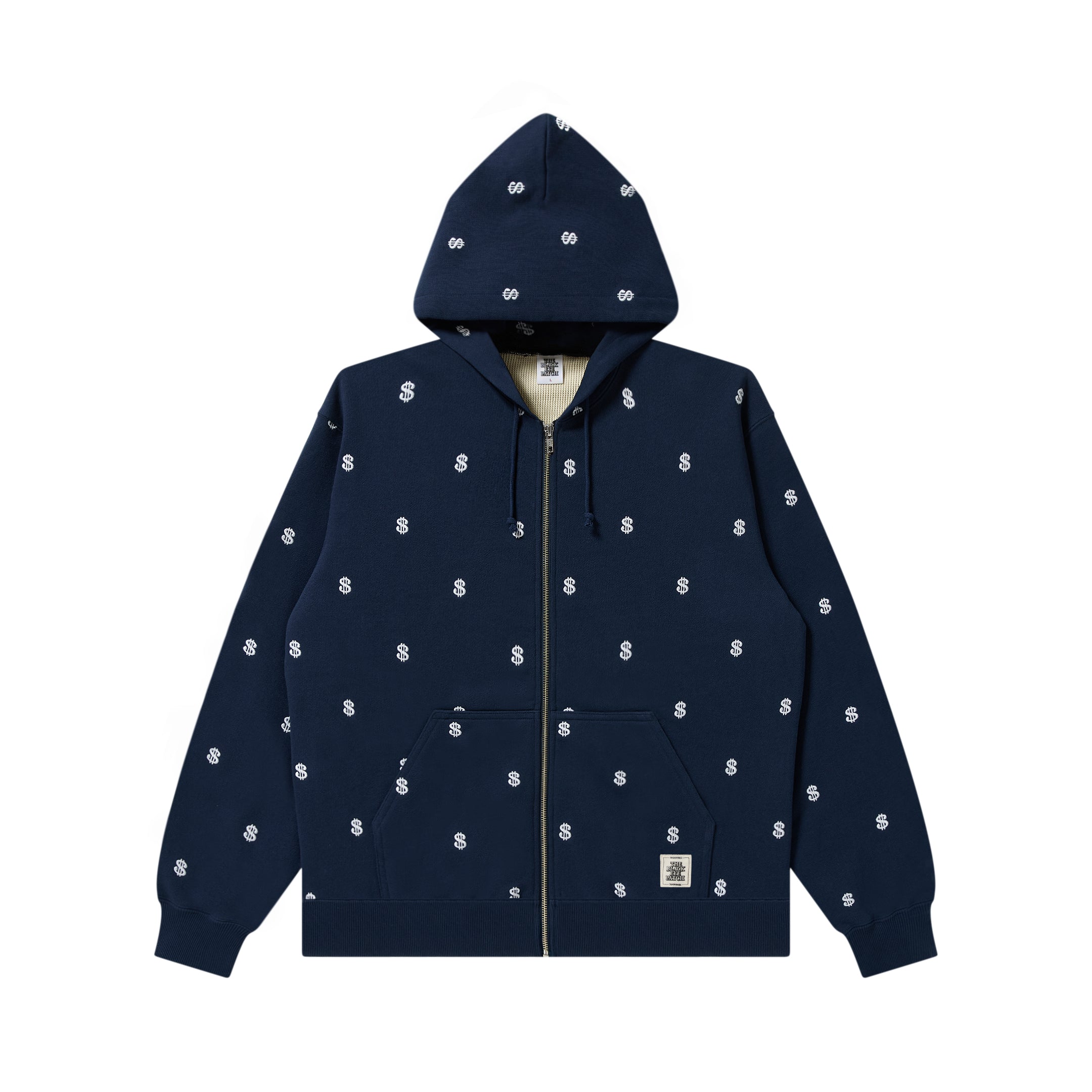 A 12.5oz zip-up hoodie featuring an all-over $ embroidery pattern. Thermal fabric lining.