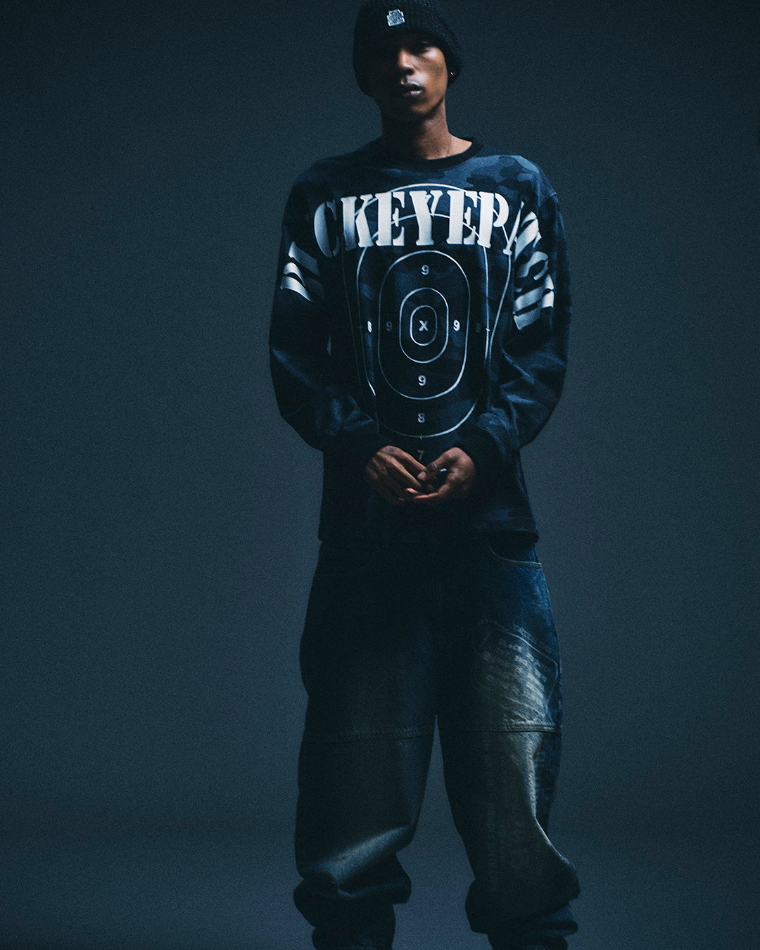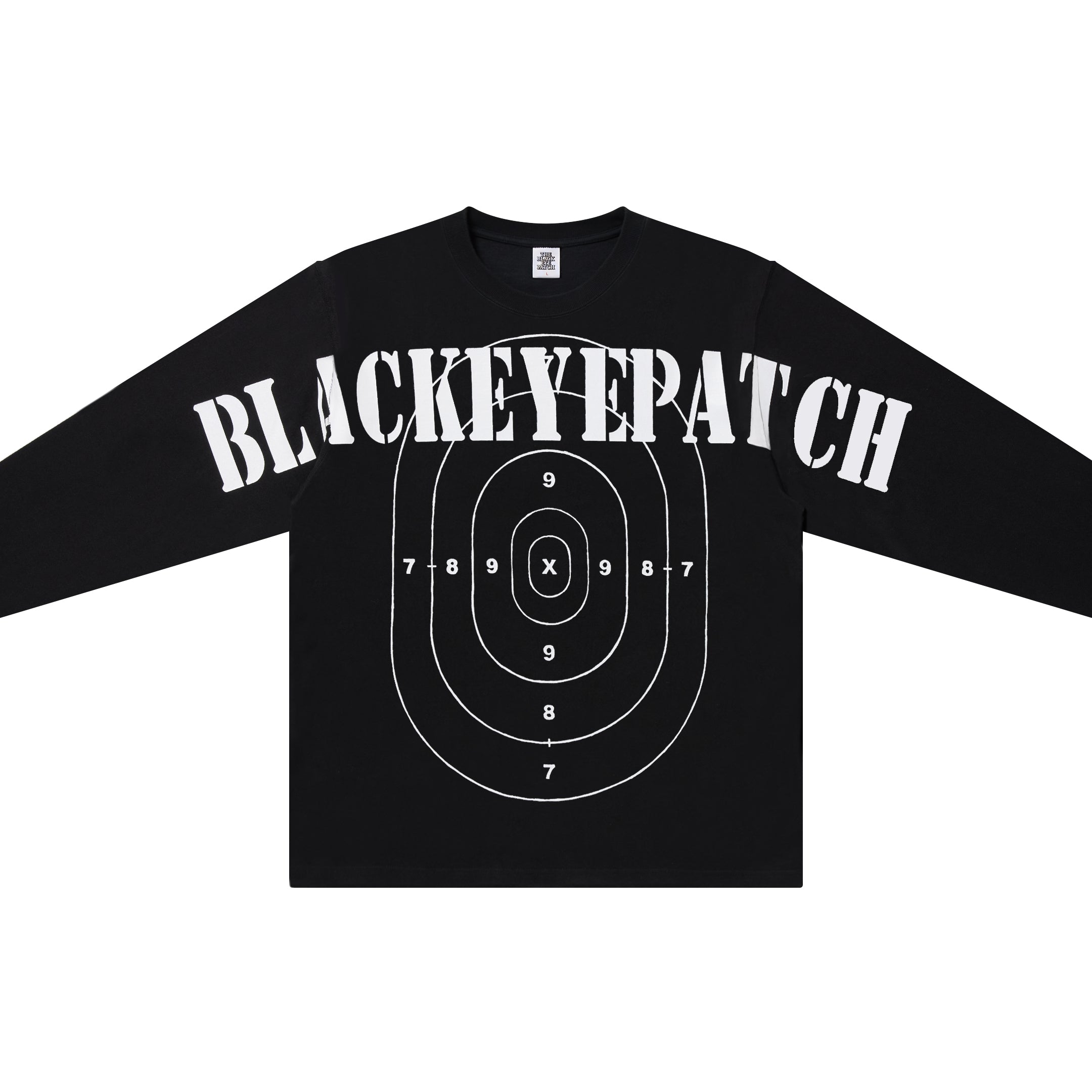 フロントには身頃から袖に跨る大きなブランドロゴとターゲットのグラフィックをプリントしたロングスリーブ T シャツ。
