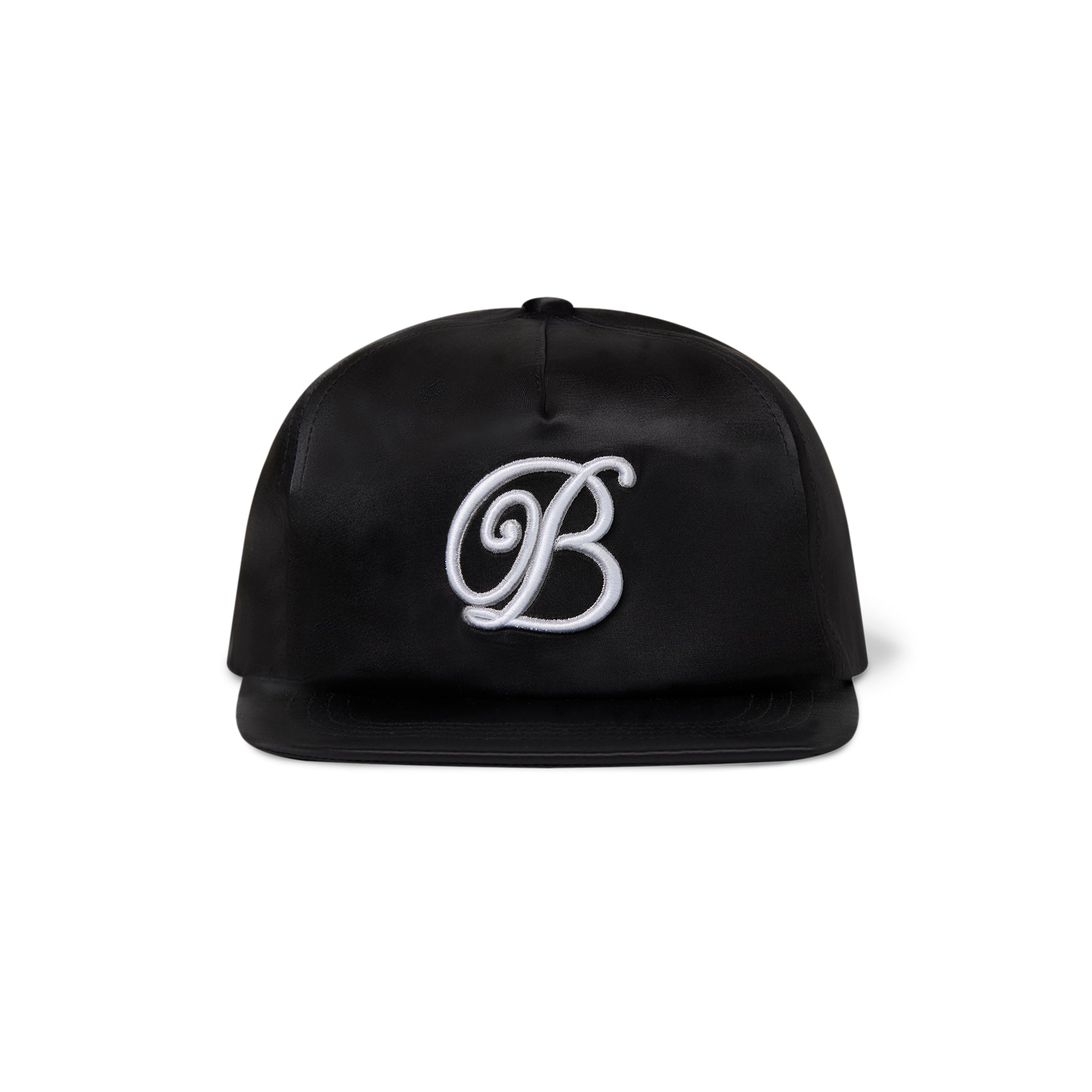 A cap made of satin fabric featuring a three-dimensional embroidered "B" emblem logo on the front.