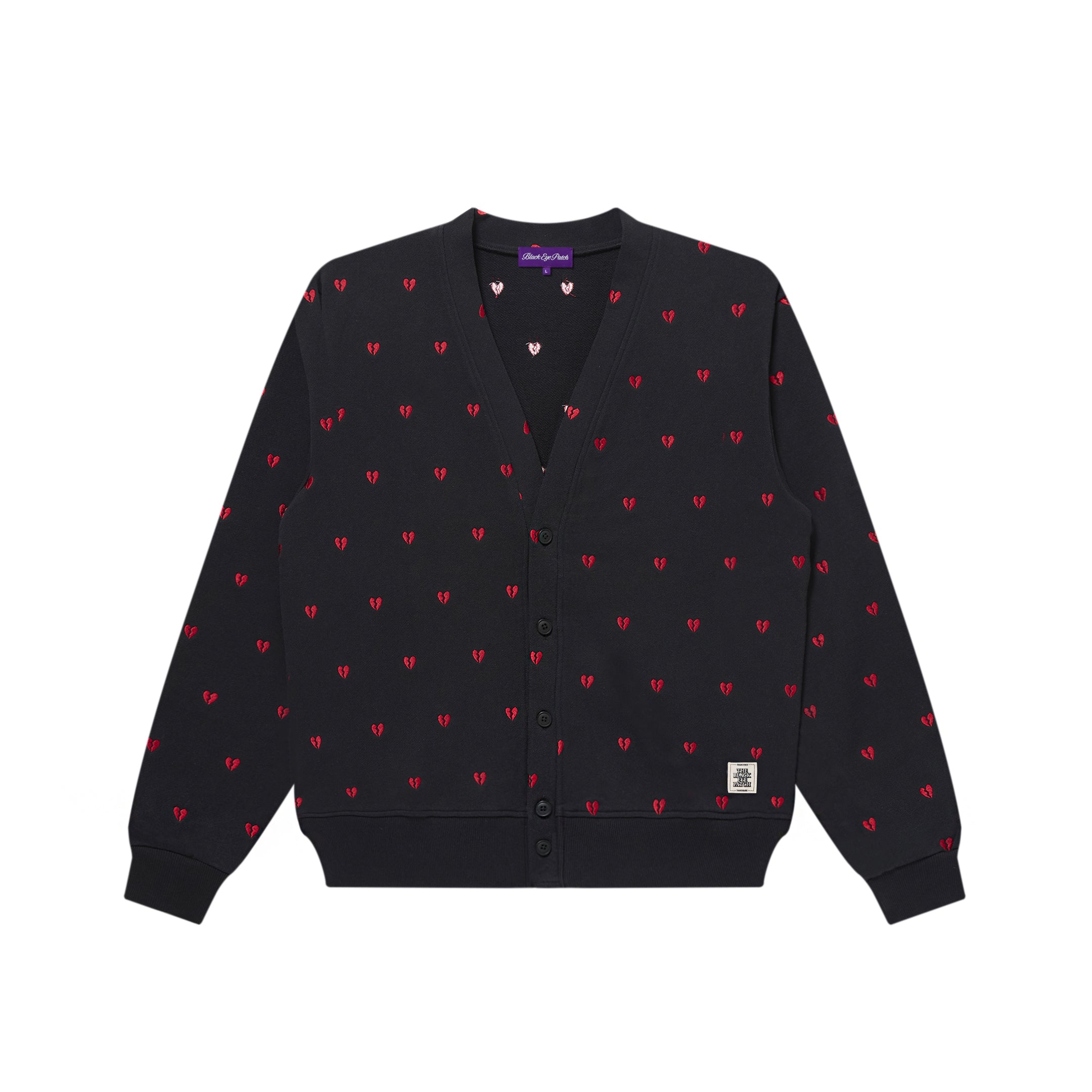A 12.5oz sweater cardigan embroidered with a pattern of broken heart motifs.