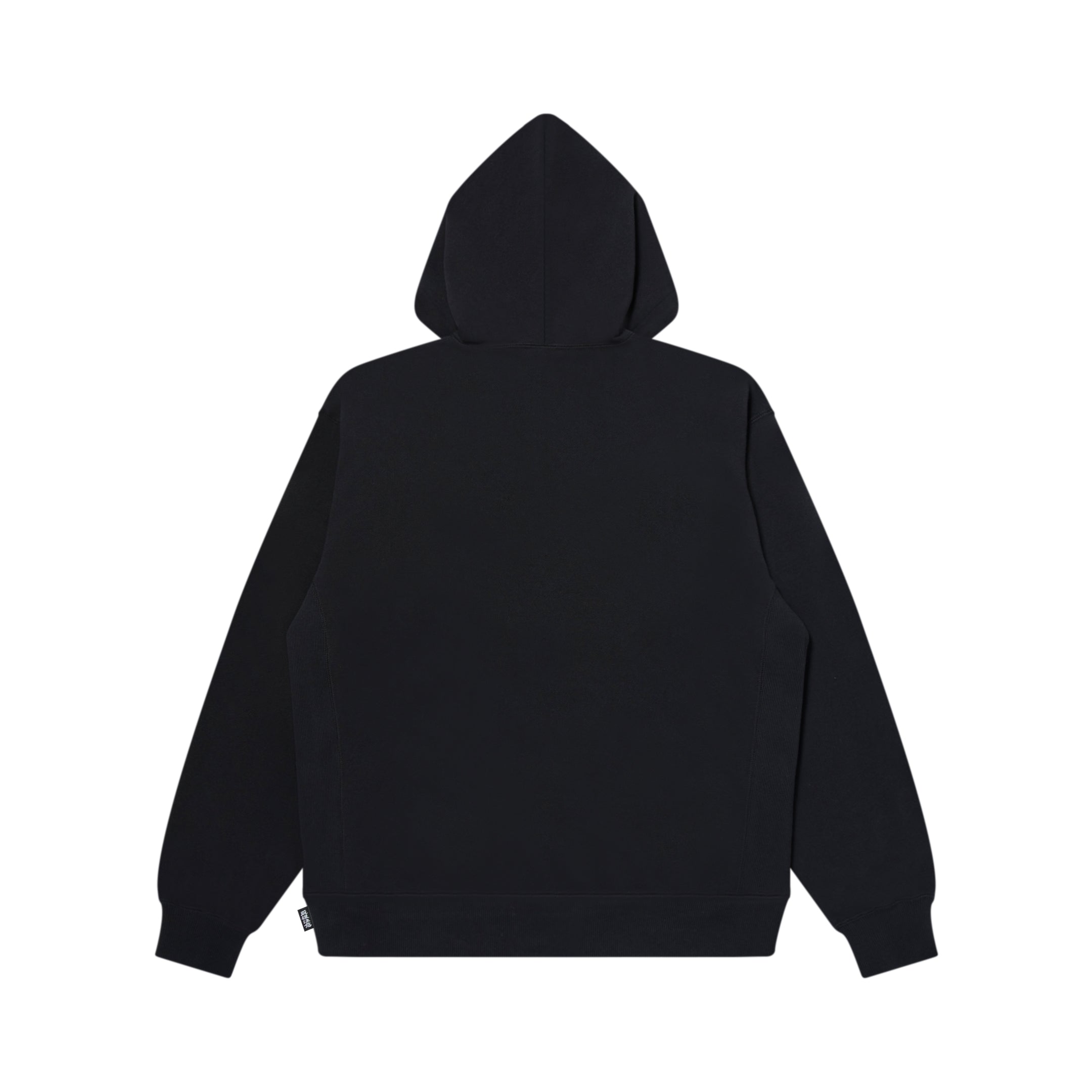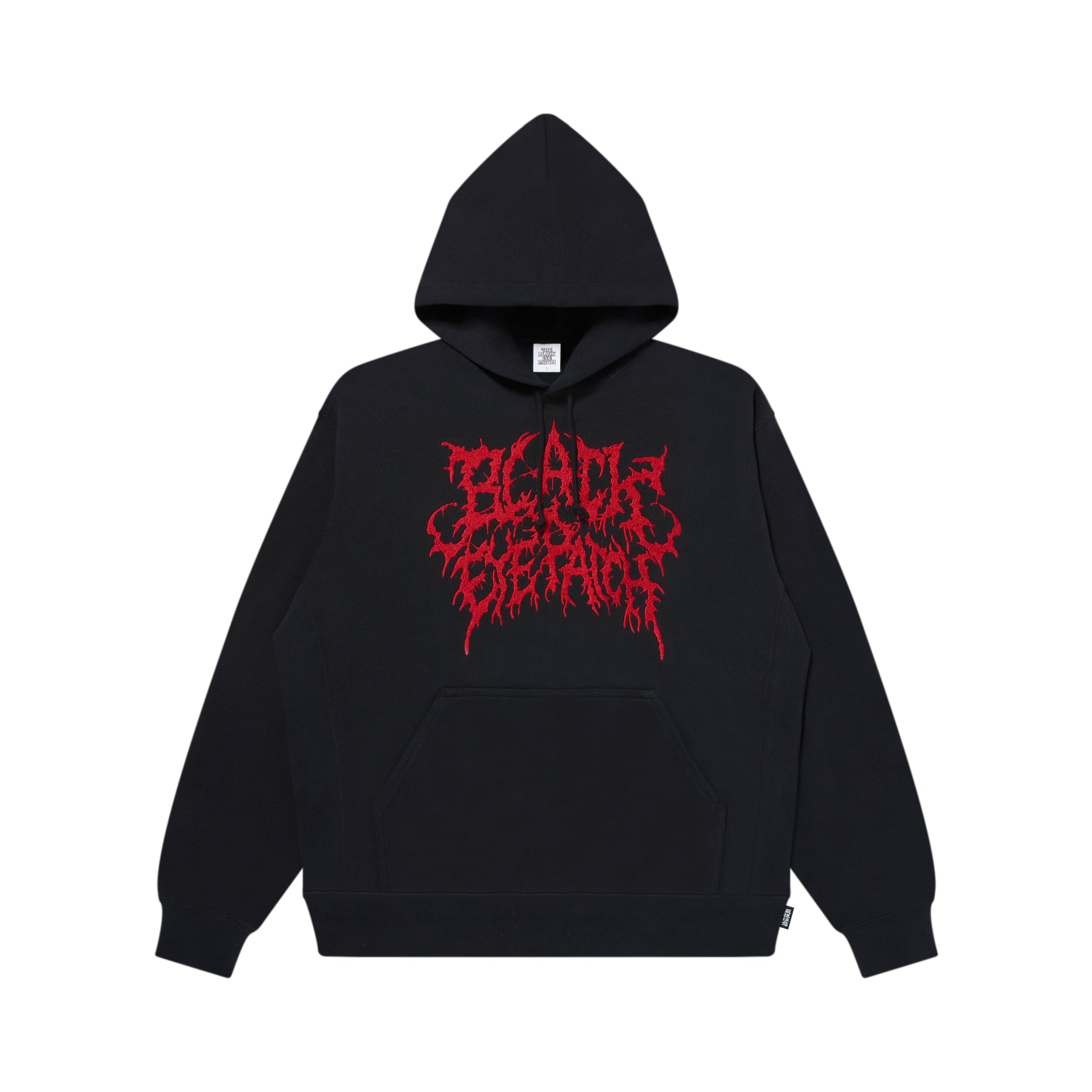 A 12.5oz pullover hoodie featuring death metal band-inspired graphic embroidery on the front.
