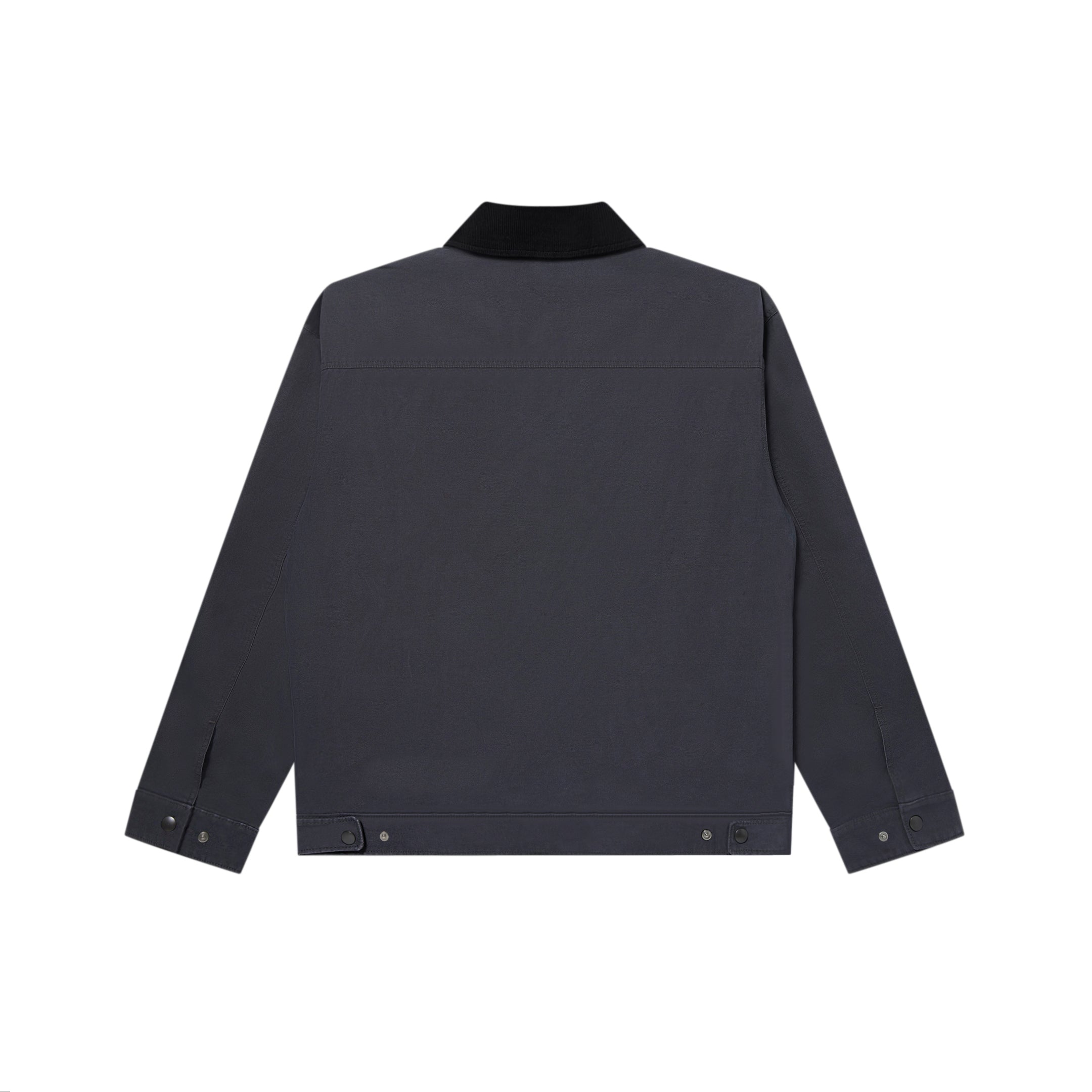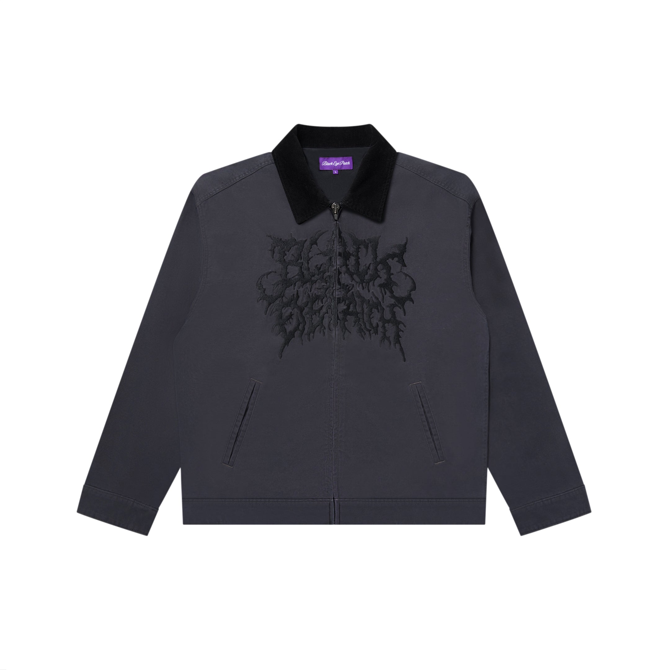 Duck fabric work jacket featuring death metal band-inspired graphic embroidery on the front.