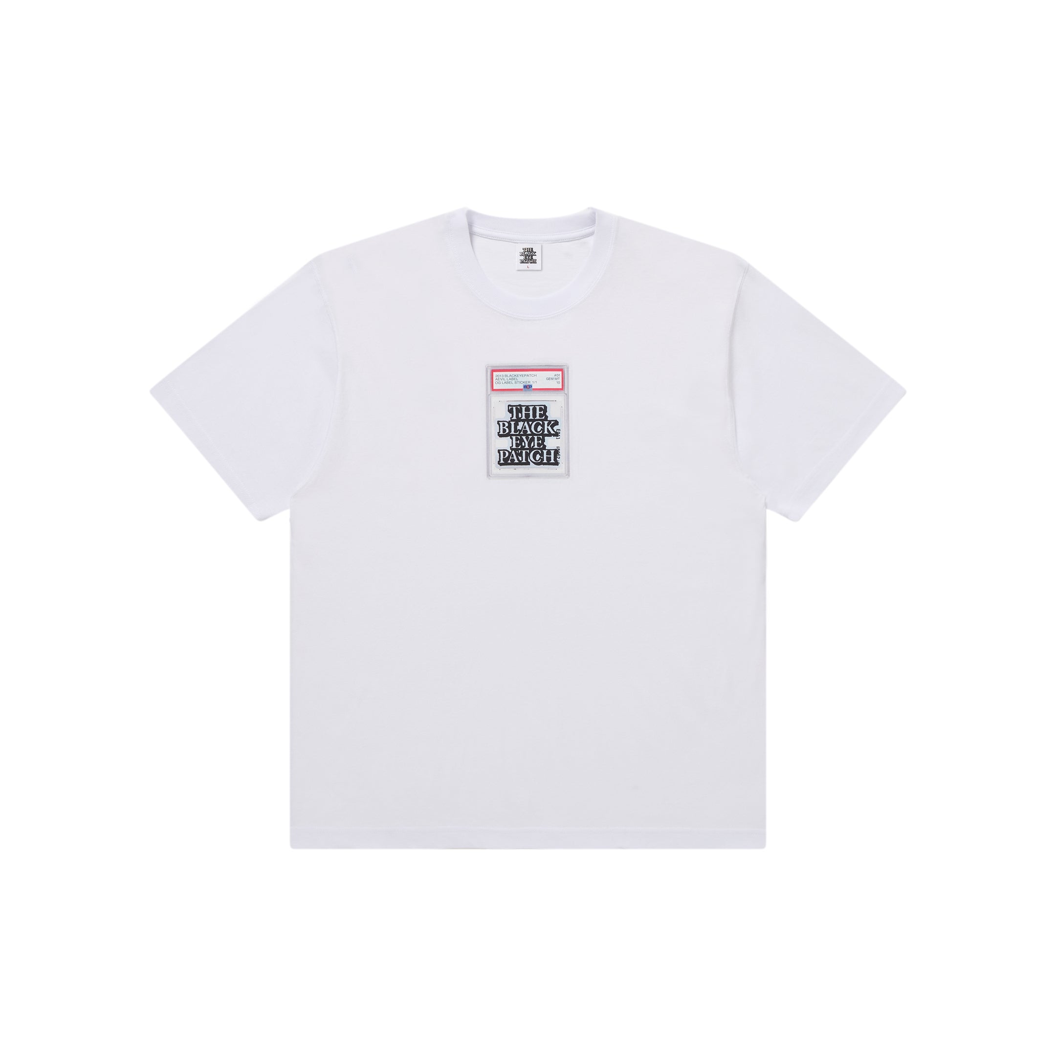 A 8.5oz t-shirt featuring an graphic of "OG LABEL" sticker enclosed in a trading card protector.