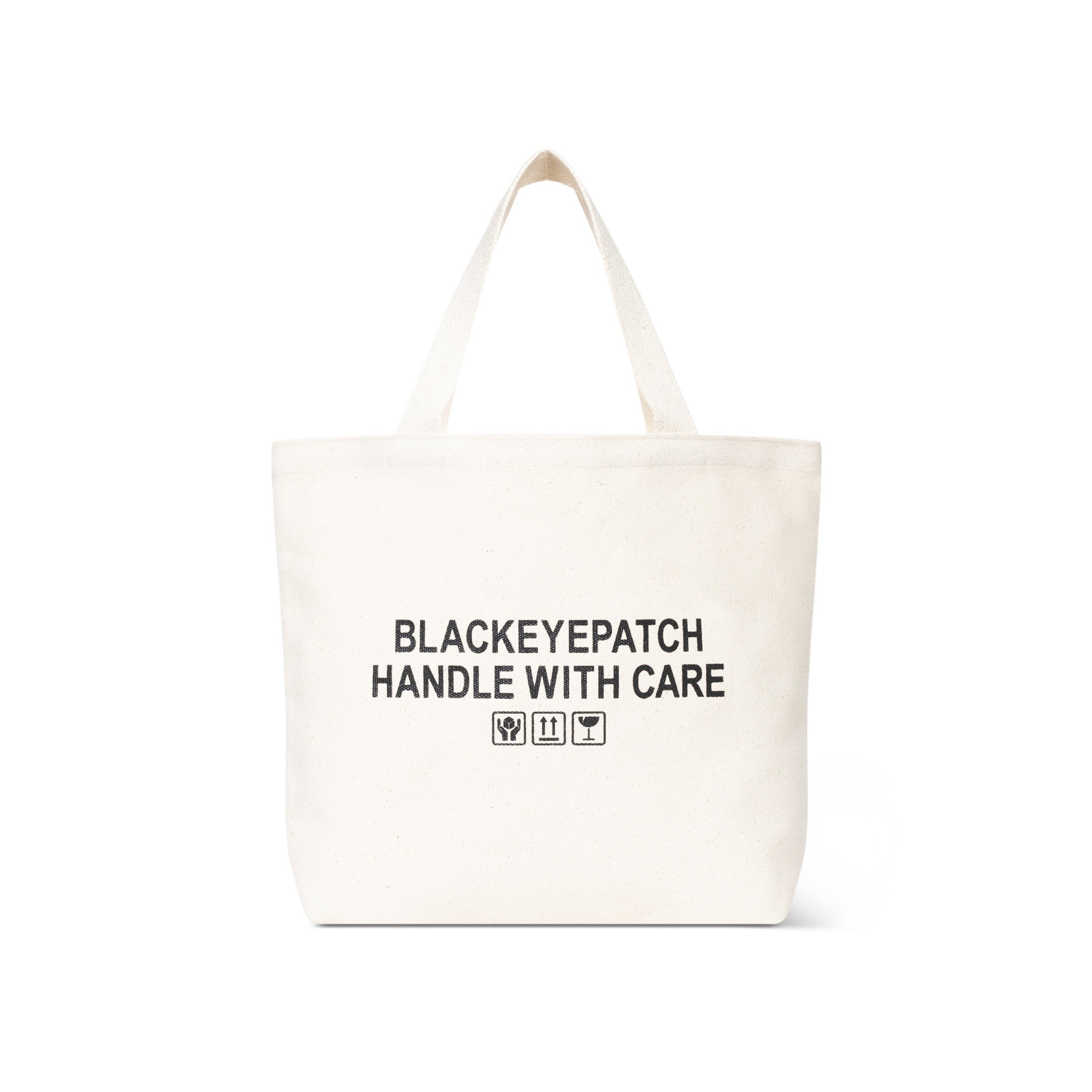 "取扱注意" と "HANDLE WITH CARE" ロゴグラフィックを両面にプリントしたキャンバス生地のミデイアムサイズのトートバッグ。内側には PVC コーティングを施している。サイズは縦 27cm × 横 35cm