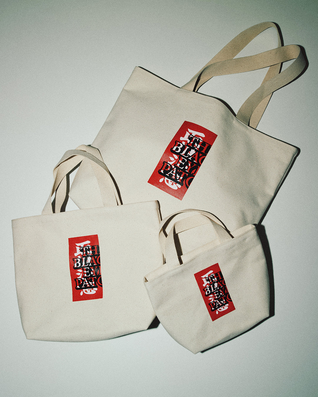 "取扱注意" と "HANDLE WITH CARE" ロゴグラフィックを両面にプリントしたキャンバス生地のスモールサイズのトートバッグ。内側には PVC コーティングを施している。サイズは縦 20cm × 横 27cm