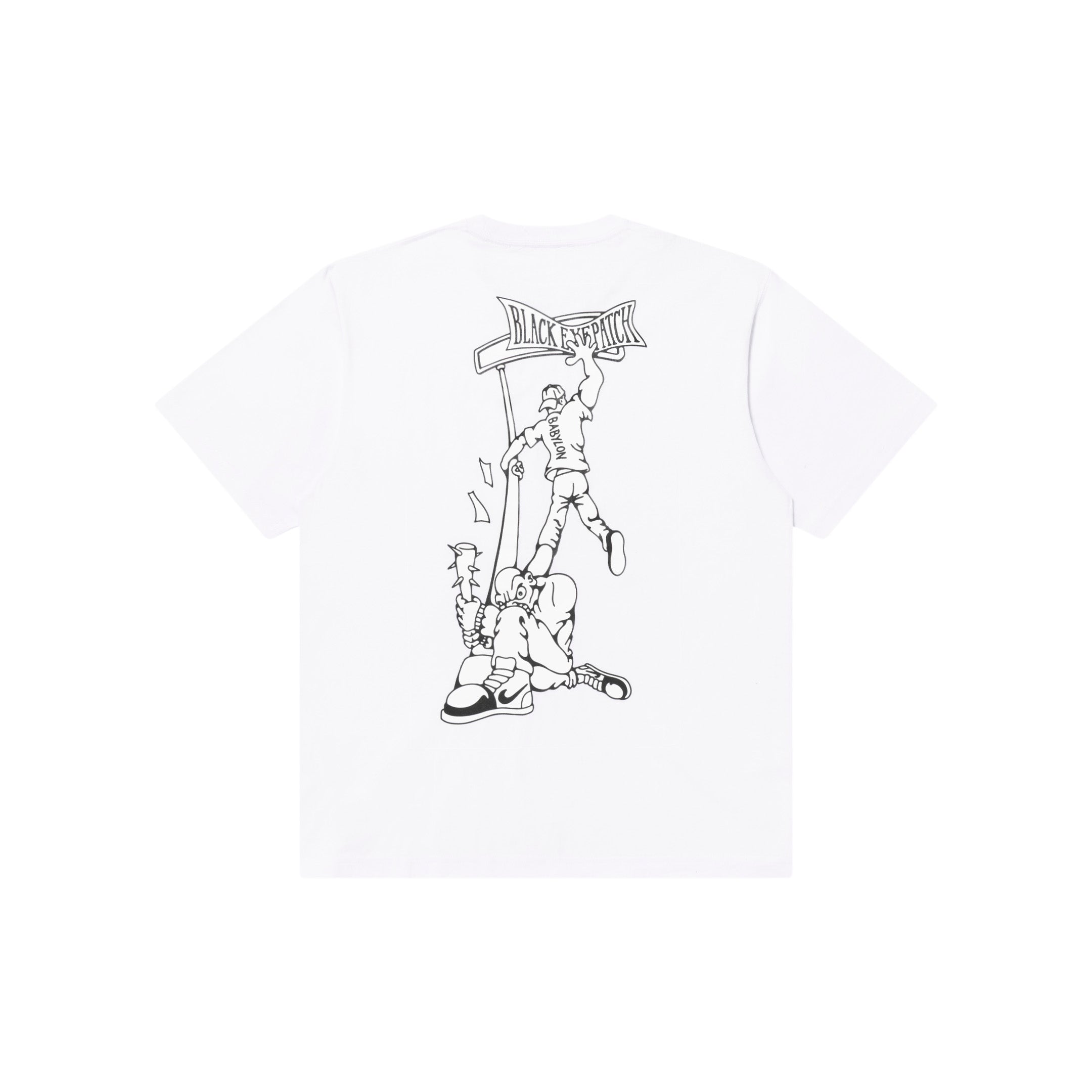 フロントには両ブランドネームのグラフィック、バックには Sticker Slap (ステッカーを貼り付ける行為) のグラフィックがプリントされた T シャツ。