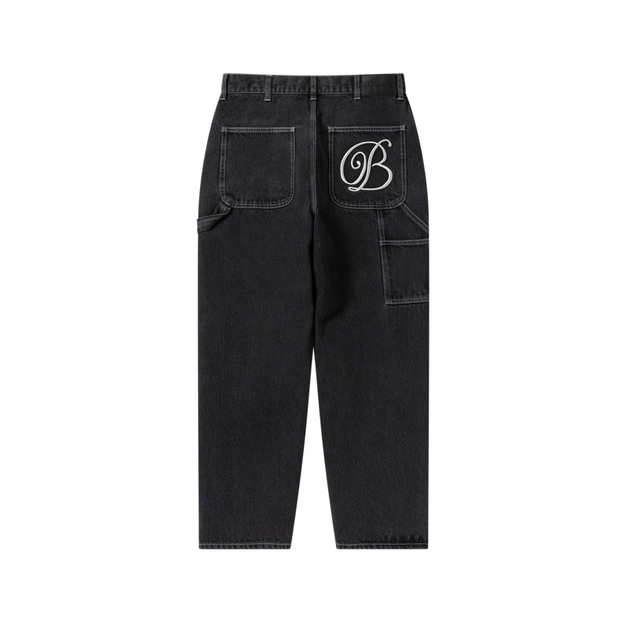 Double-knee denim pants featuring a washed finish for a washed look. The "B EMBLEM" logo is 3D embroidered on the back pockets.