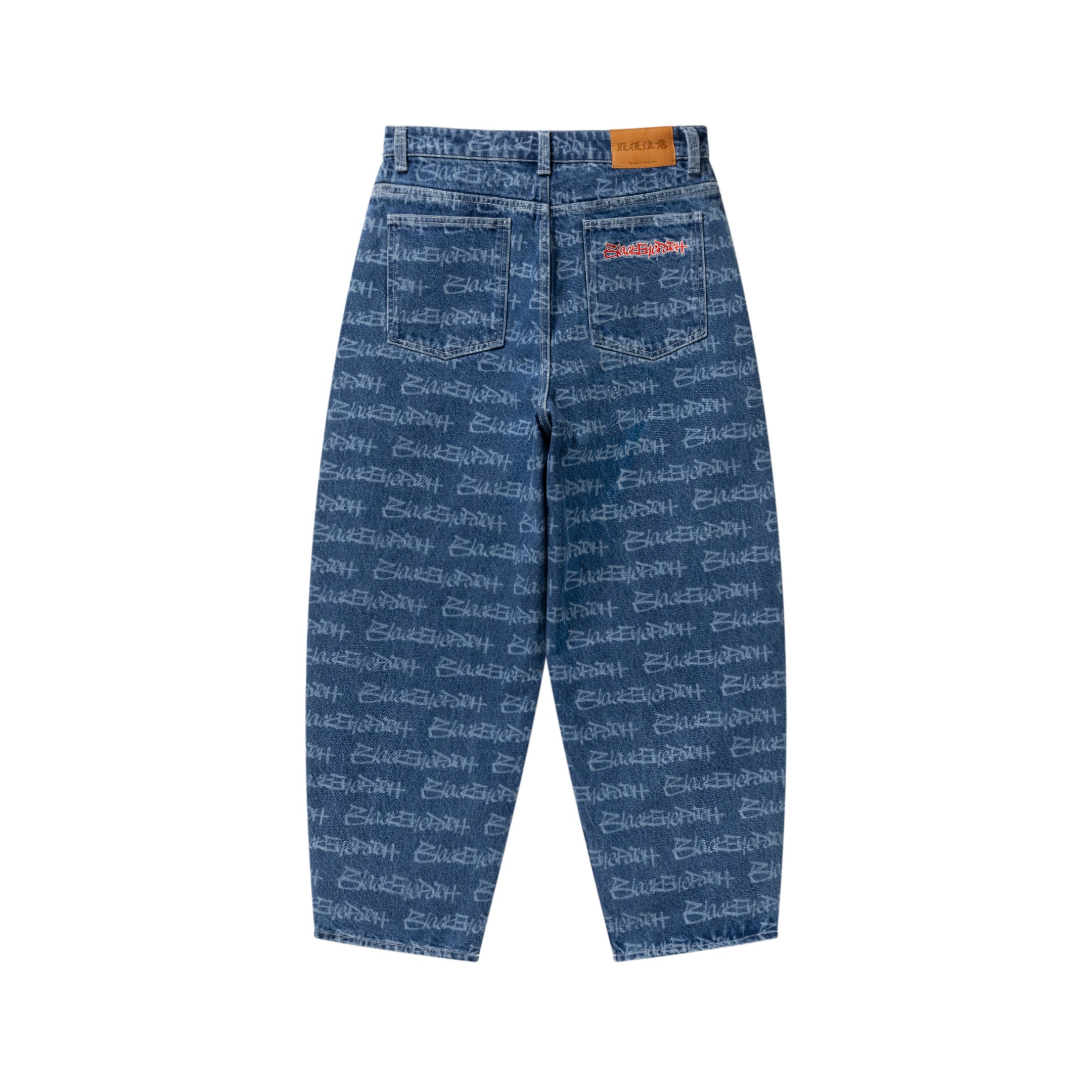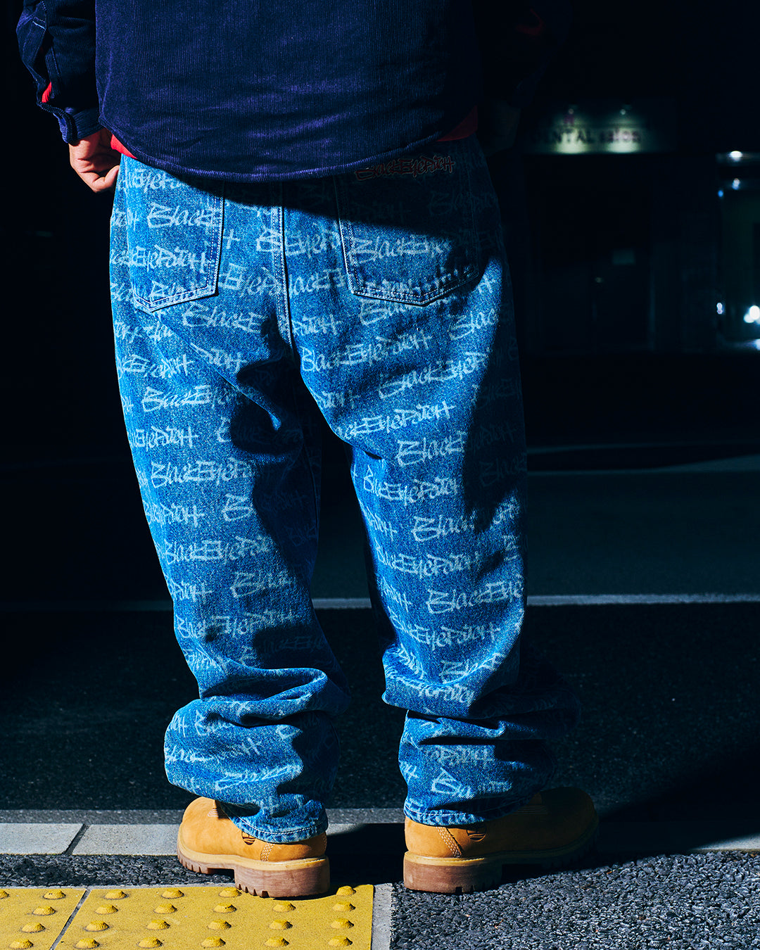 BEP のタグ調グラフィックをレーザープリントで施した総柄のエクストラバギージーンズ。