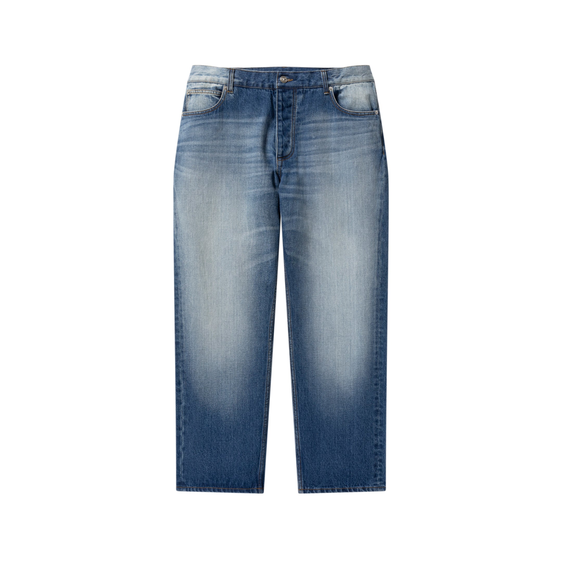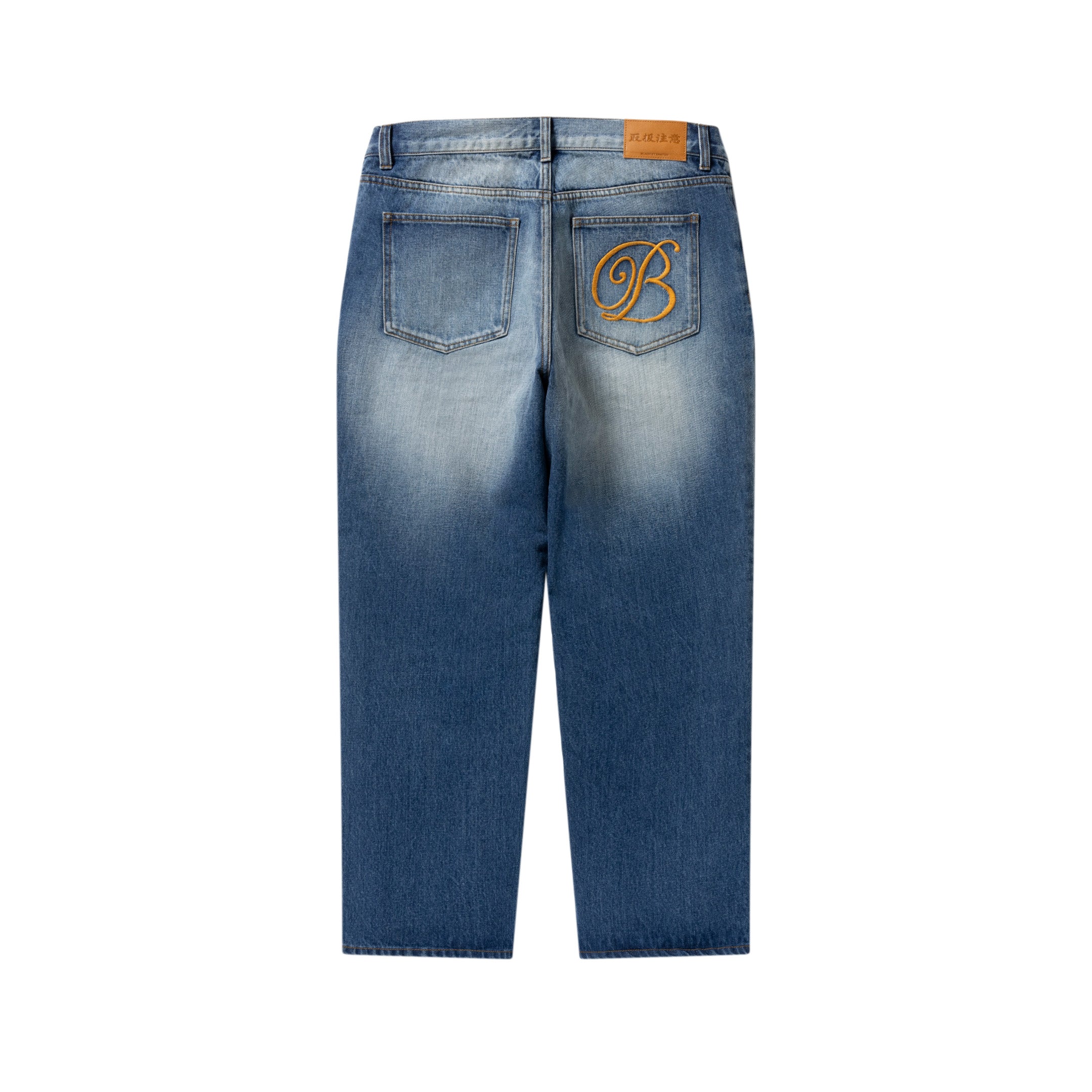 Brand's standard baggy jeans featuring "B EMBLEM" logo on the back pocket embroidered with urethane for a three-dimensional effect. Made of 13.5 oz. denim fabric with a large wash on the thighs, hips, and other areas.