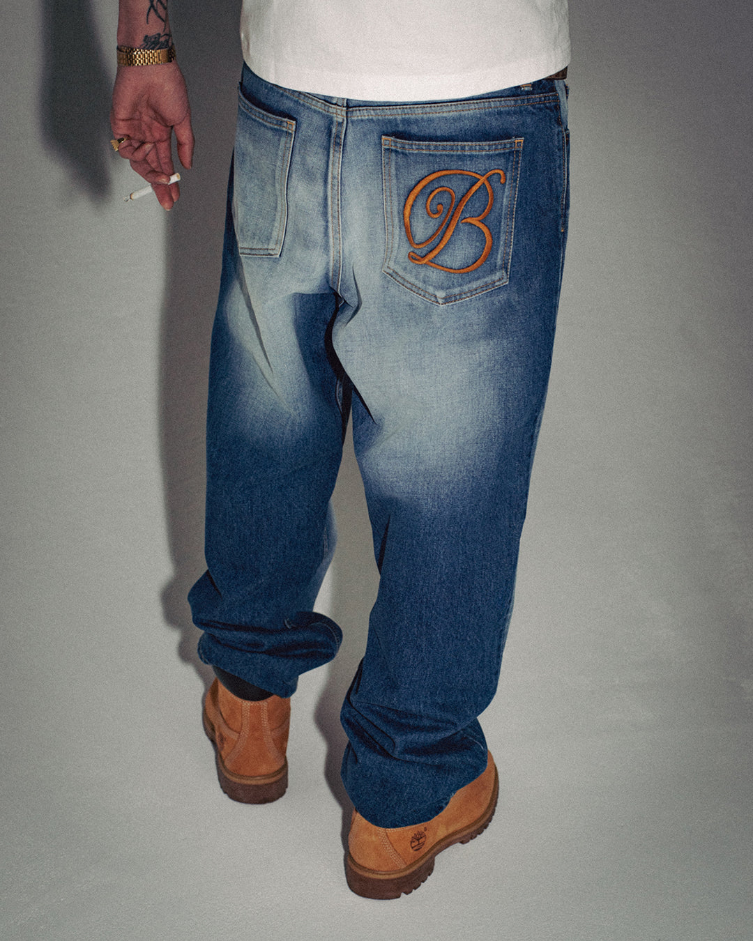 バックポケットに "B EMBLEM" ロゴを立体感のあるウレタン入り刺繍で施したブランド定番のバギージーンズ。