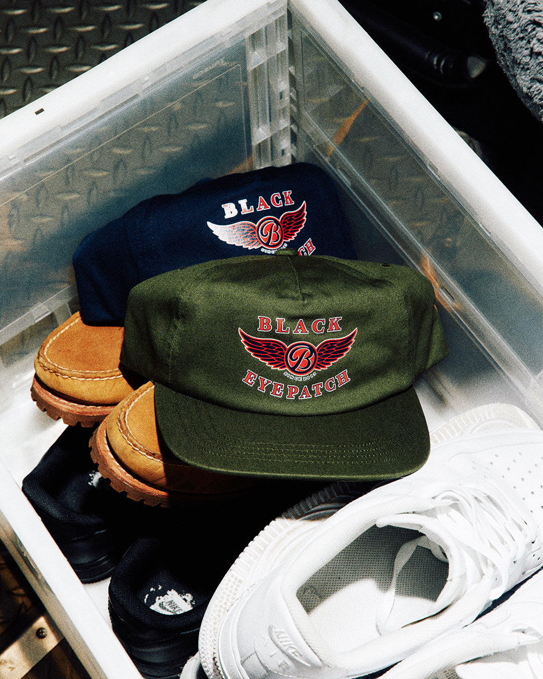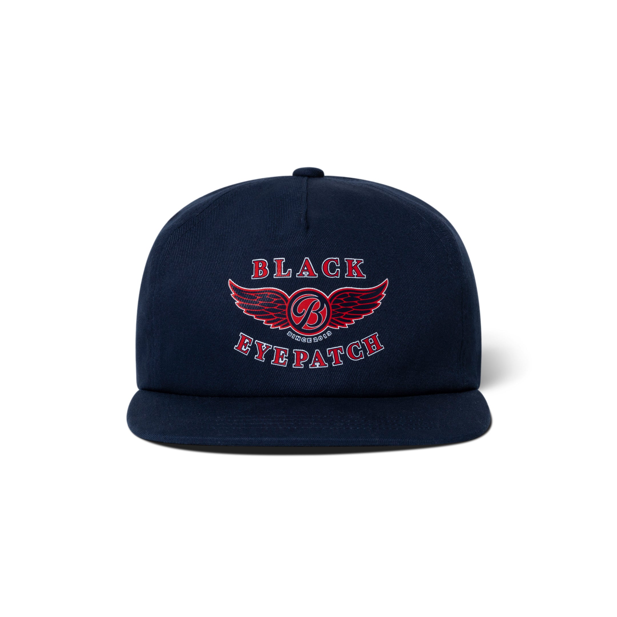 "B" エンブレムに新たにウイングを取り入れたグラフィックがプリントされたパネルキャップ。スナップバック仕様で背面にもブランドロゴの刺繍が入る。