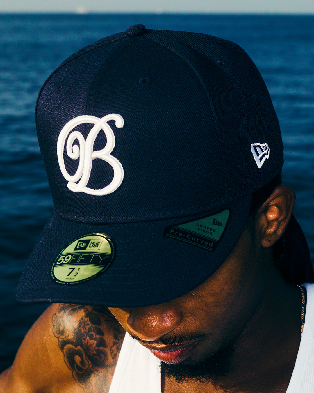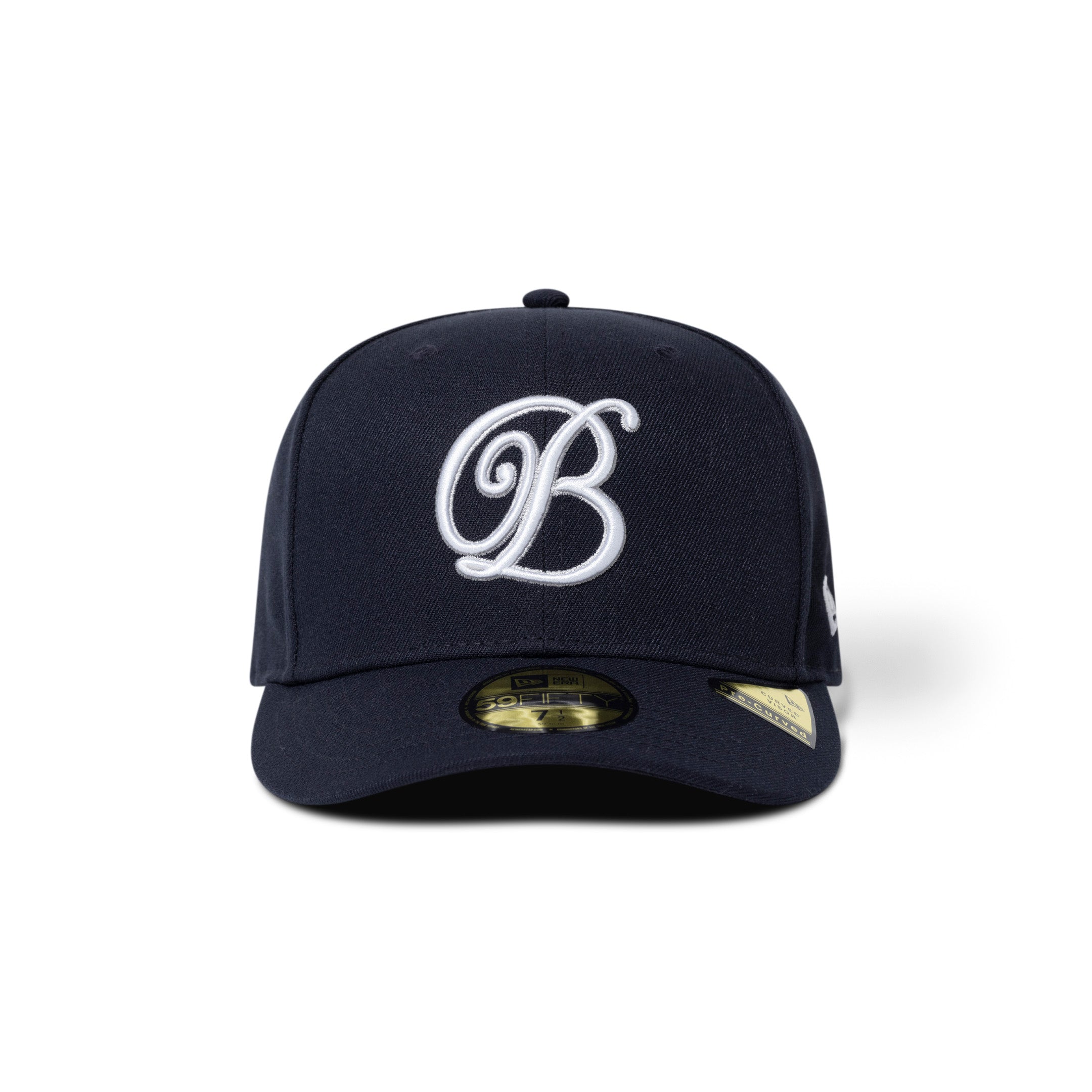 A navy baseball cap exclusively made-to-order by NEW ERA, featuring the polyurethane embroidery of the “B EMBLEM” logo. Made with New Era's Pre Curved 59FIFTY® design.