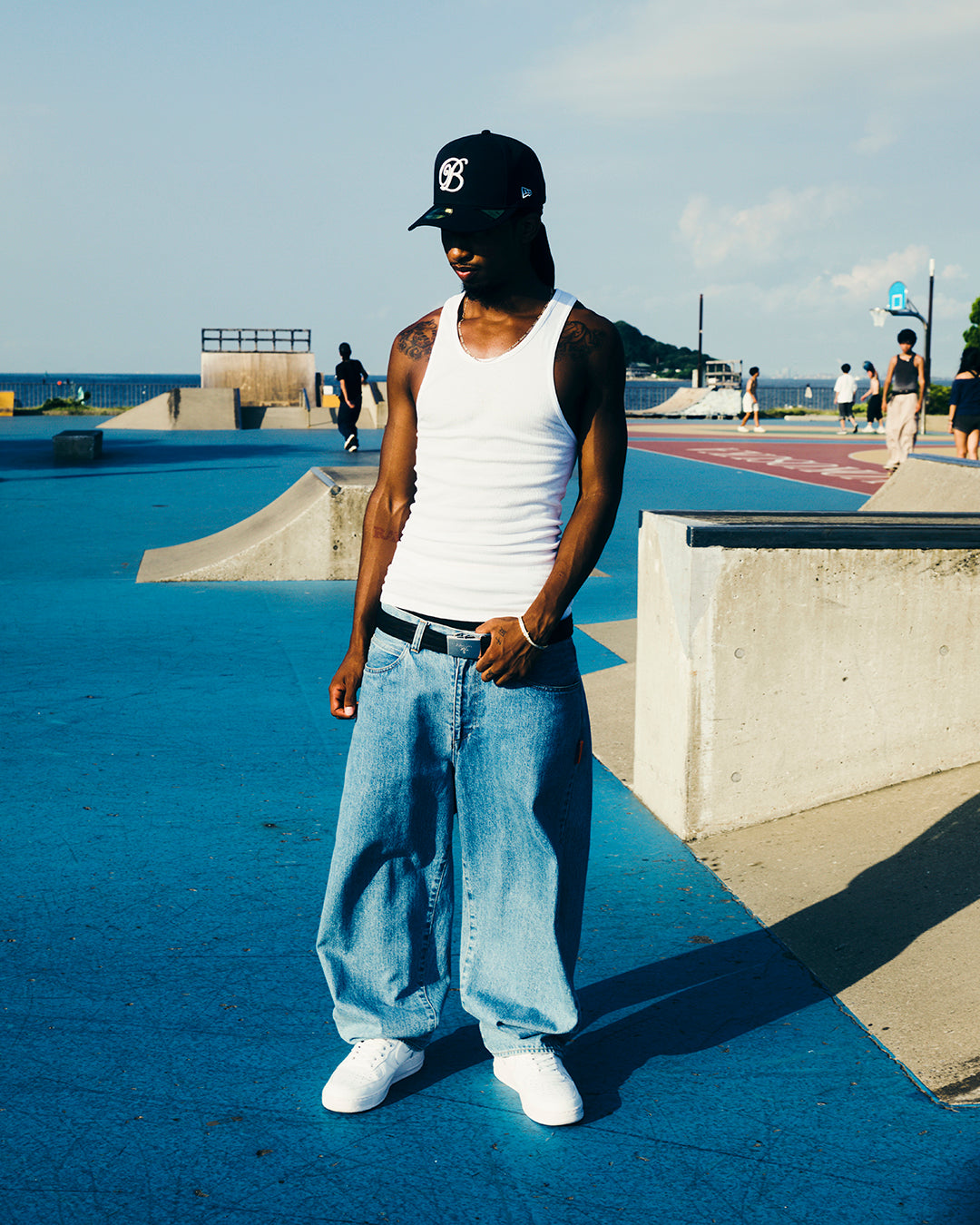NEW ERA 別注のフロントに "B EMBLEM" のロゴをウレタン刺繍で施したネイビーのベースボールキャップ。