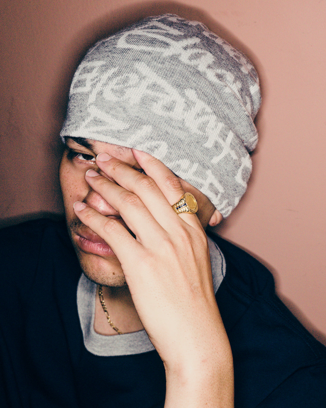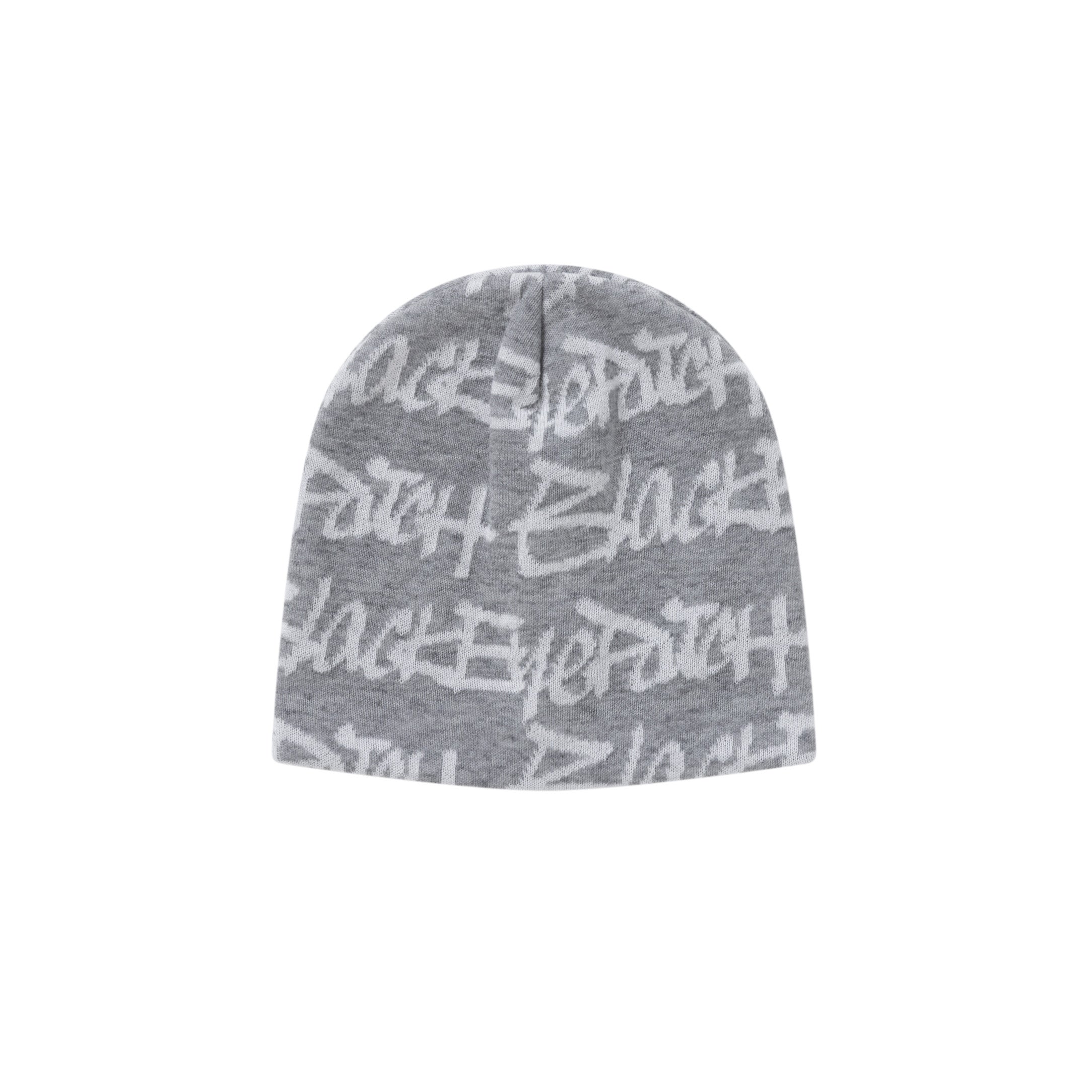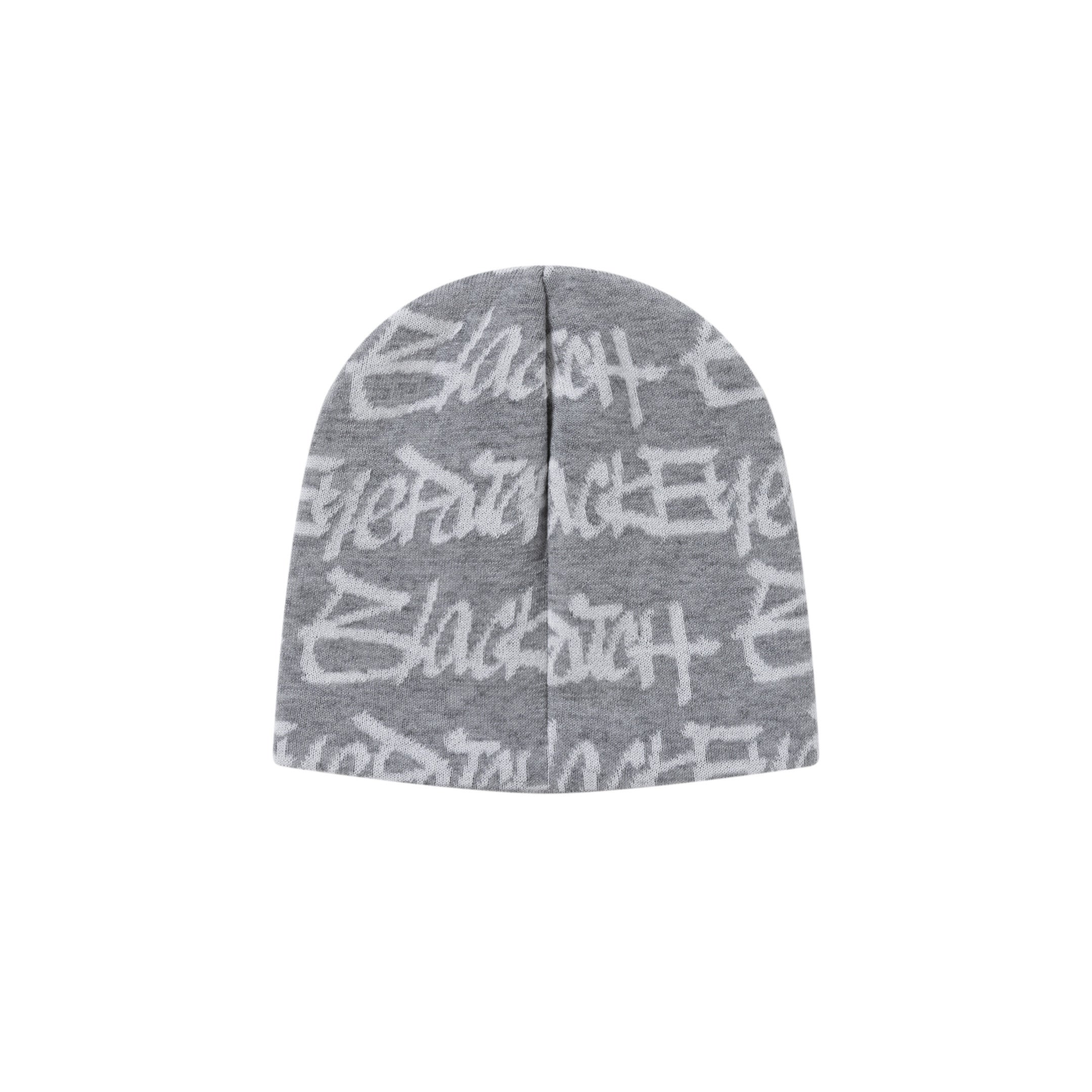 オリジナルのグラフィティフォントでブランド名を表現し、ジャガードで全面に落とし込んだ総柄シングルビーニー。