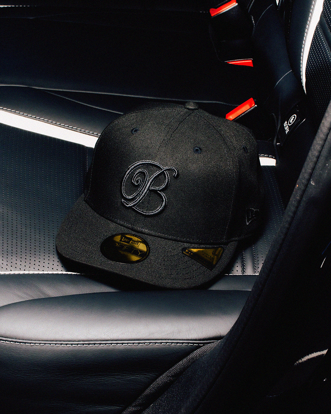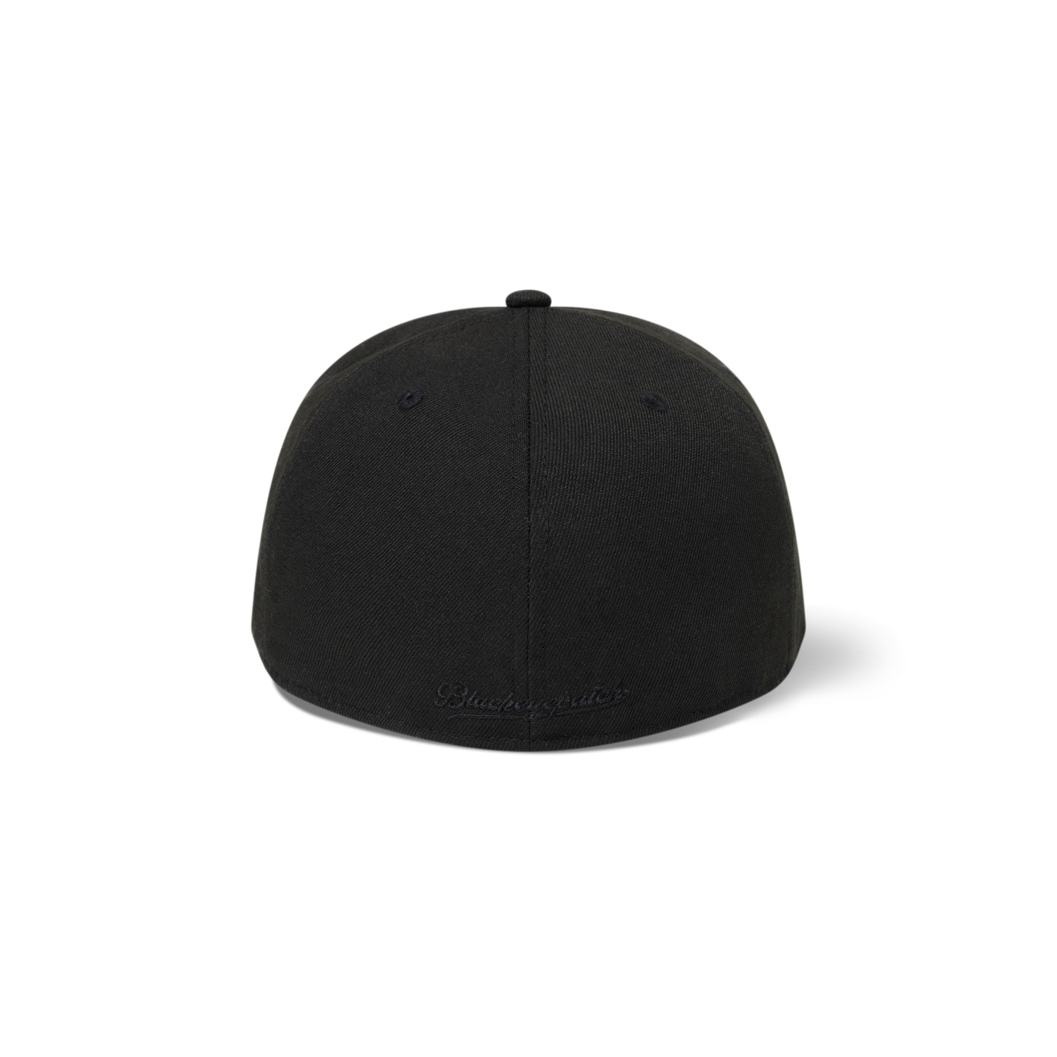 NEW ERA® custom-made all-black baseball cap featuring "B EMBLEM" logo embroidered in urethane on the front. Pre Curved 59FIFTY® body.