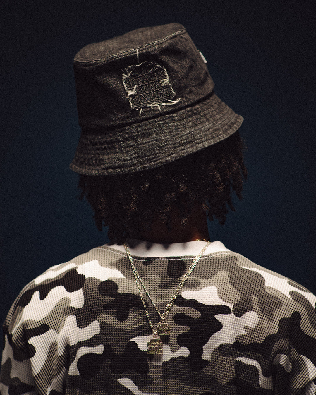 ブラックデニムにウォッシュ加工を施したボディに共地の "OG LABEL" ワッペンを付けたバケットハット。