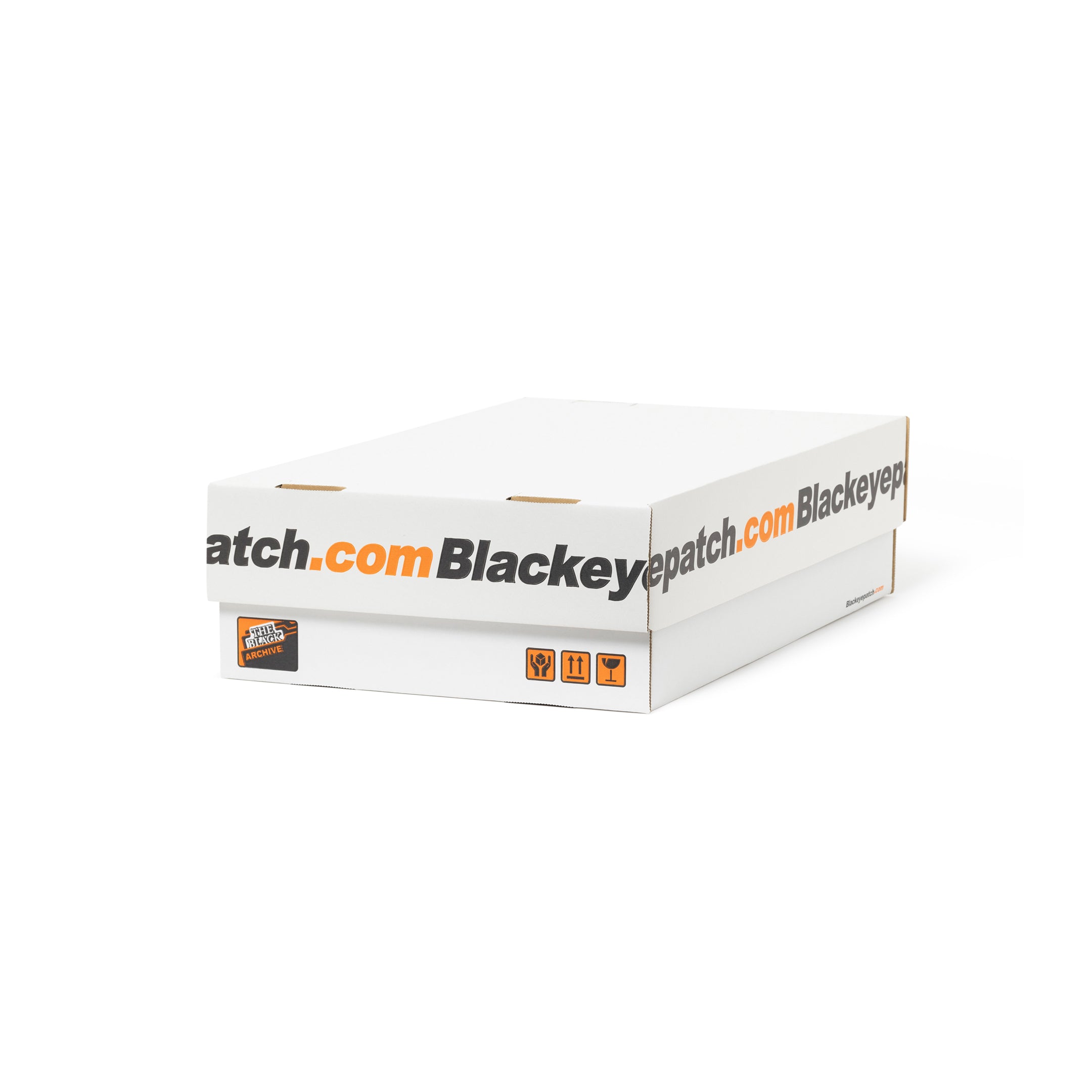 BlackEyePatch のデザインアイデンティティである「ラベル」や「業務用ステッカー」のデザインを落とし込んだ A4 サイズの段ボール製 BOX。雑誌や ZINE、説明書、書類など、厚みや高さのないコレクションに最適。3箱セットのため、見せる収納も。