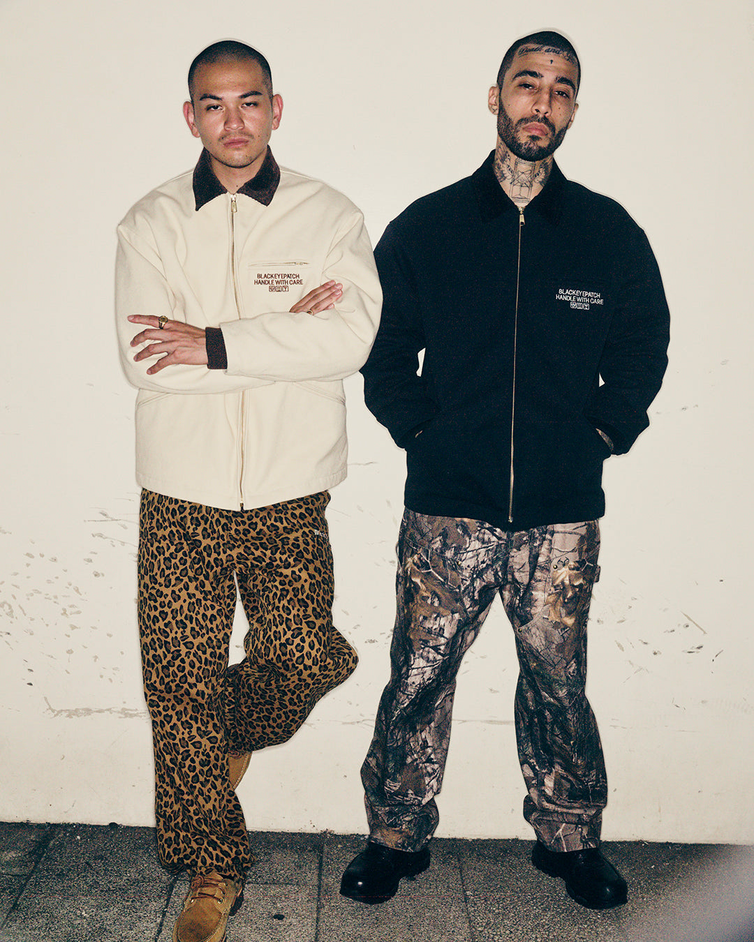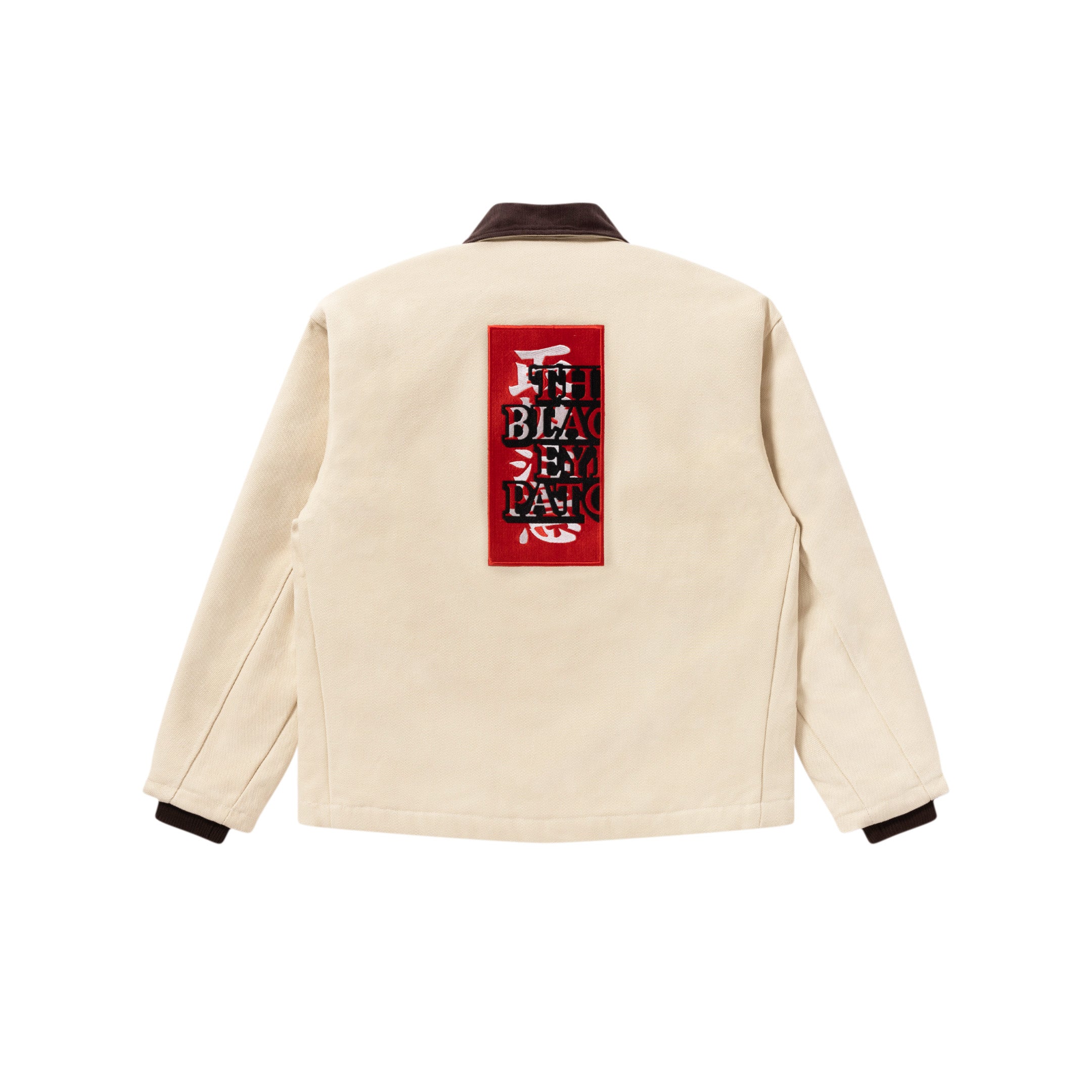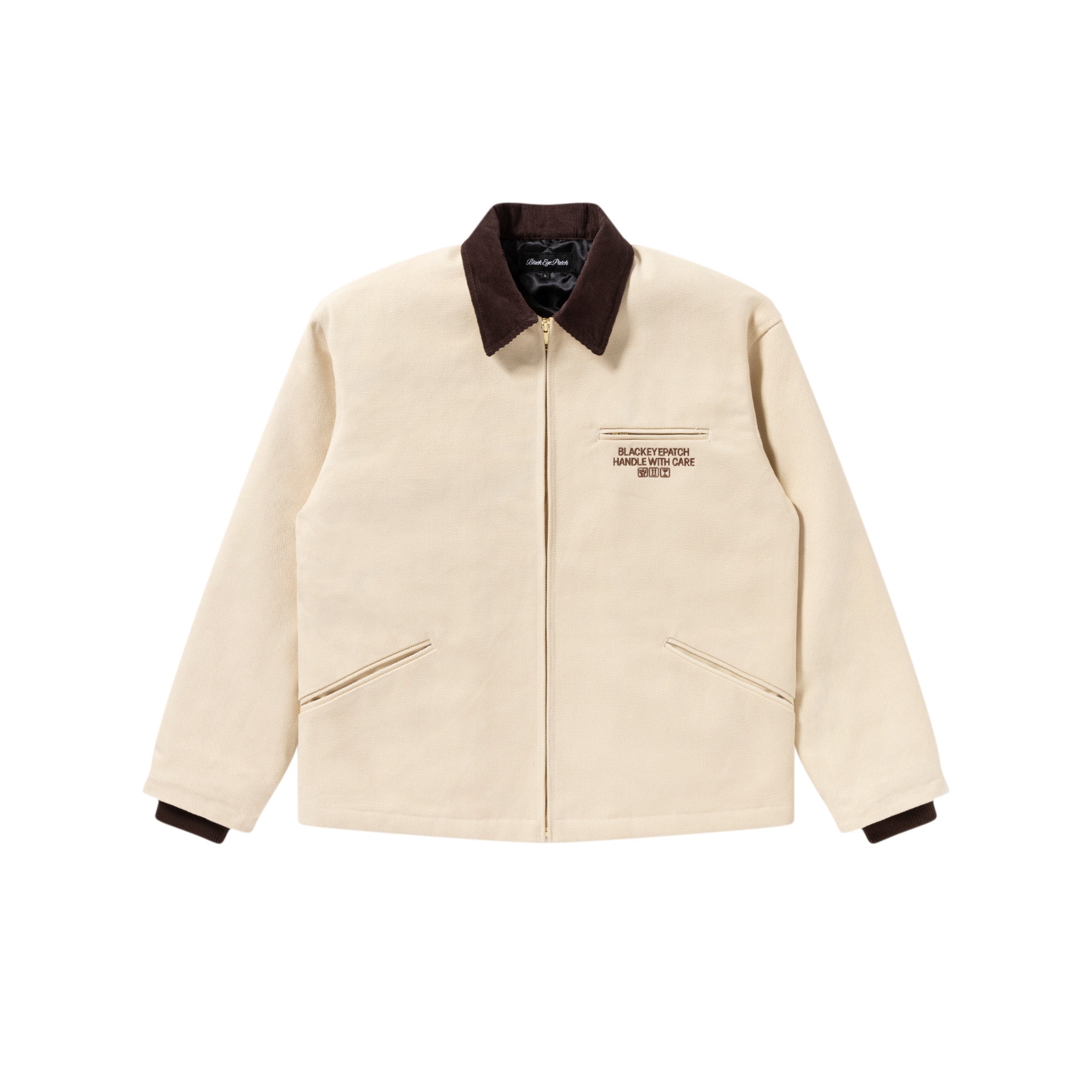 A hard worker’s jacket made with 20oz duck fabric. Features include the "HANDLE WITH CARE" logo embroidered on the left chest, and a graphic embroidery of the text "handle with care" label logo at the back. Corduroy fabric accents the collar, with ribbed sleeves and diamond-shaped quilted lining.