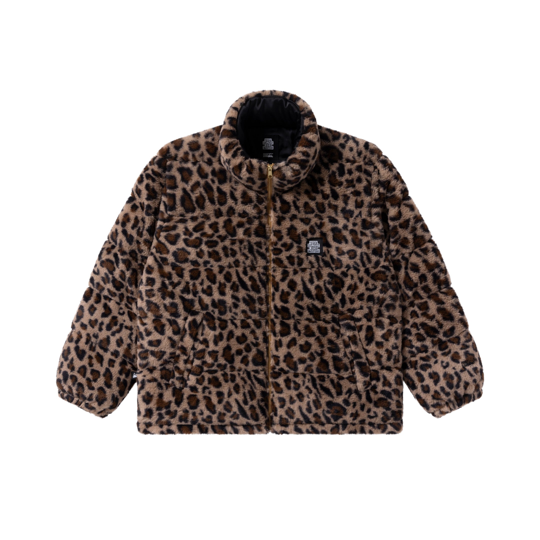 Down jacket in collaboration with FIRST DOWN featuring a faux fur leopard pattern dropped in. A square “OG LABEL” patch is placed on the left chest, and a gold zipper adds a sense of luxury.