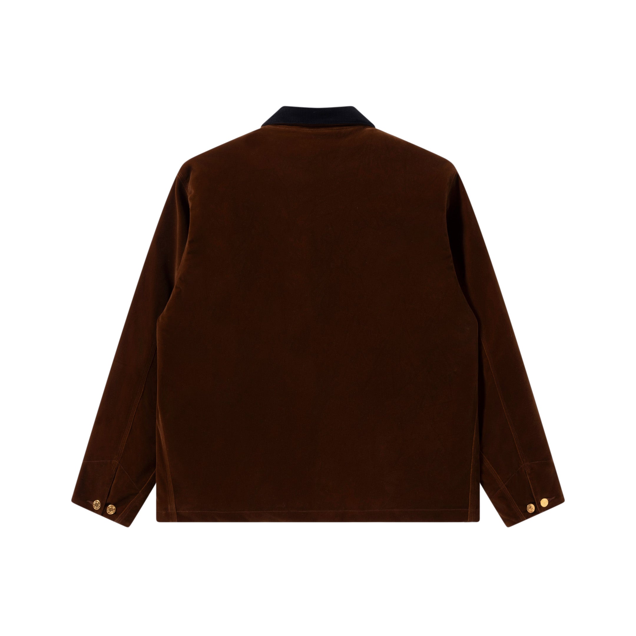 Coverall jacket featuring velour outer fabric and quilted lining with padding. The collar is corduroy with a square “OG LABEL” leather patch on the left chest pocket and gold buttons and rivets for a luxurious feel.