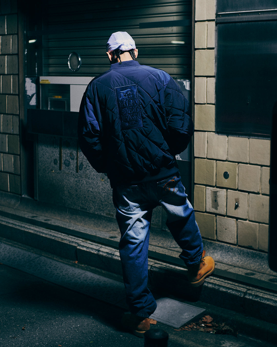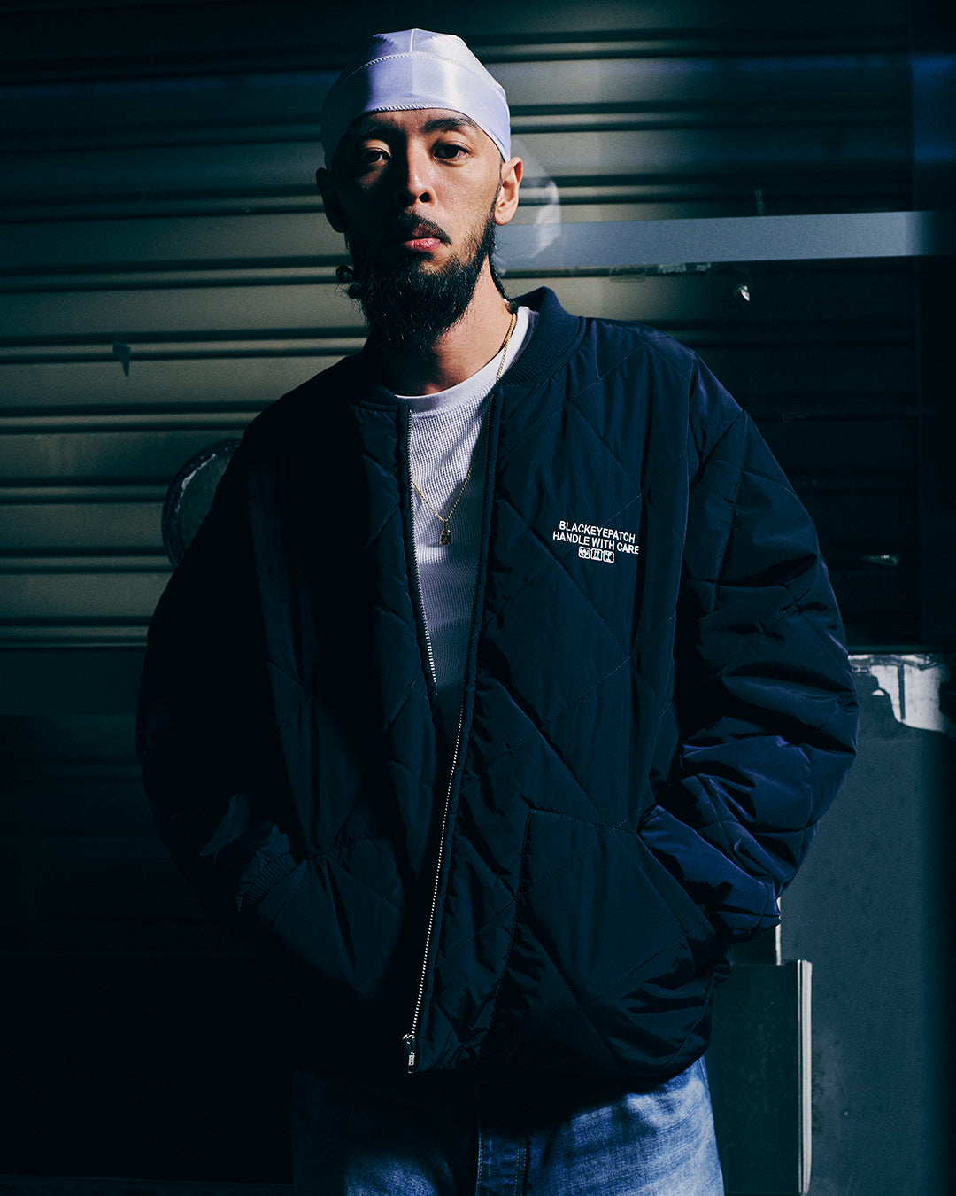 左胸に "HWC" グラフィックを刺繍、バックにはボディと同系色の "取扱注意" グラフィックの刺繍ワッペンを施した 2000 年代初頭の HIPHOP ギア感を漂わせるキルティングジャケット。