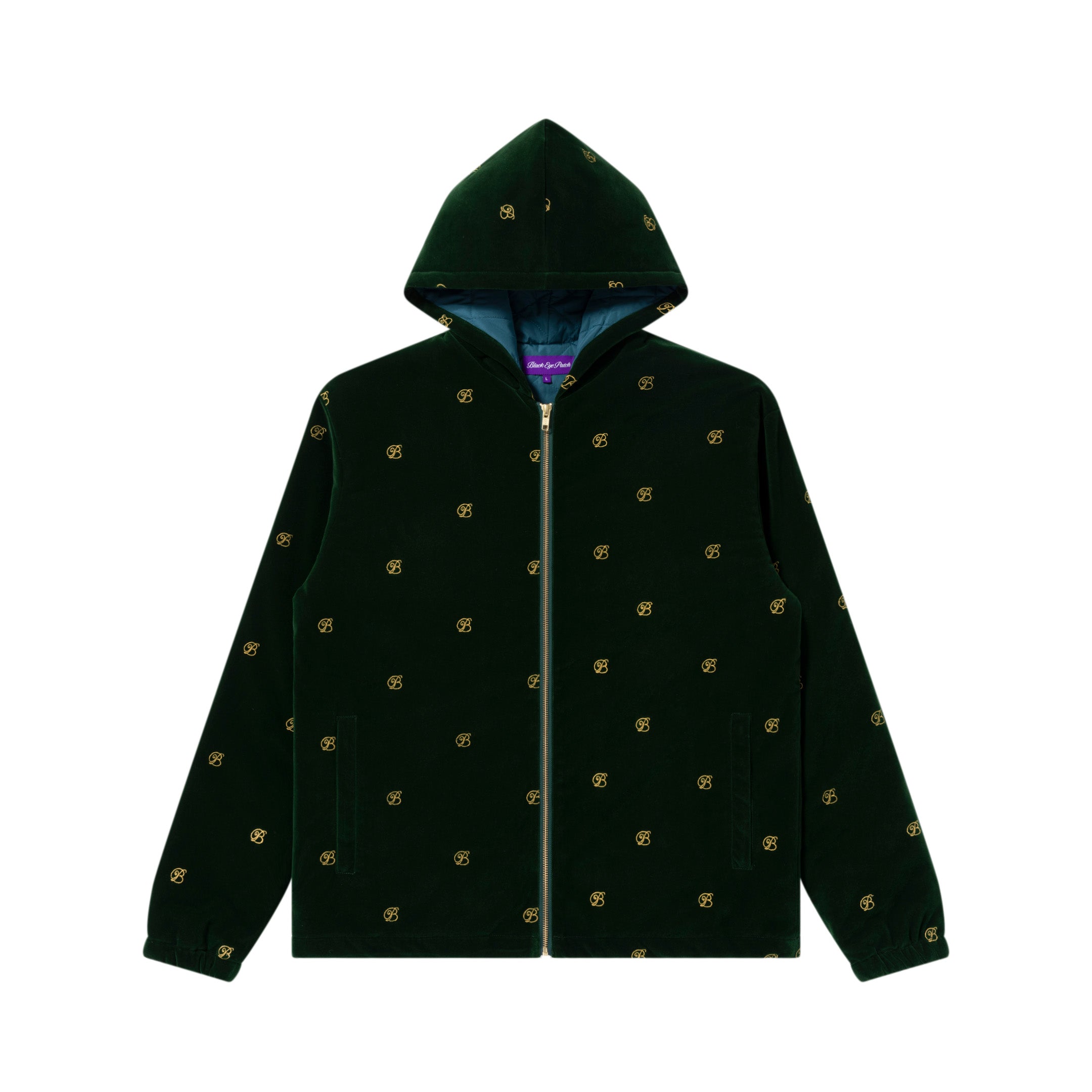 "B EMBLEM" logo embroidered all over this all-over zip hooded jacket. The outer fabric is made of velour and the lining is quilted with padding.
