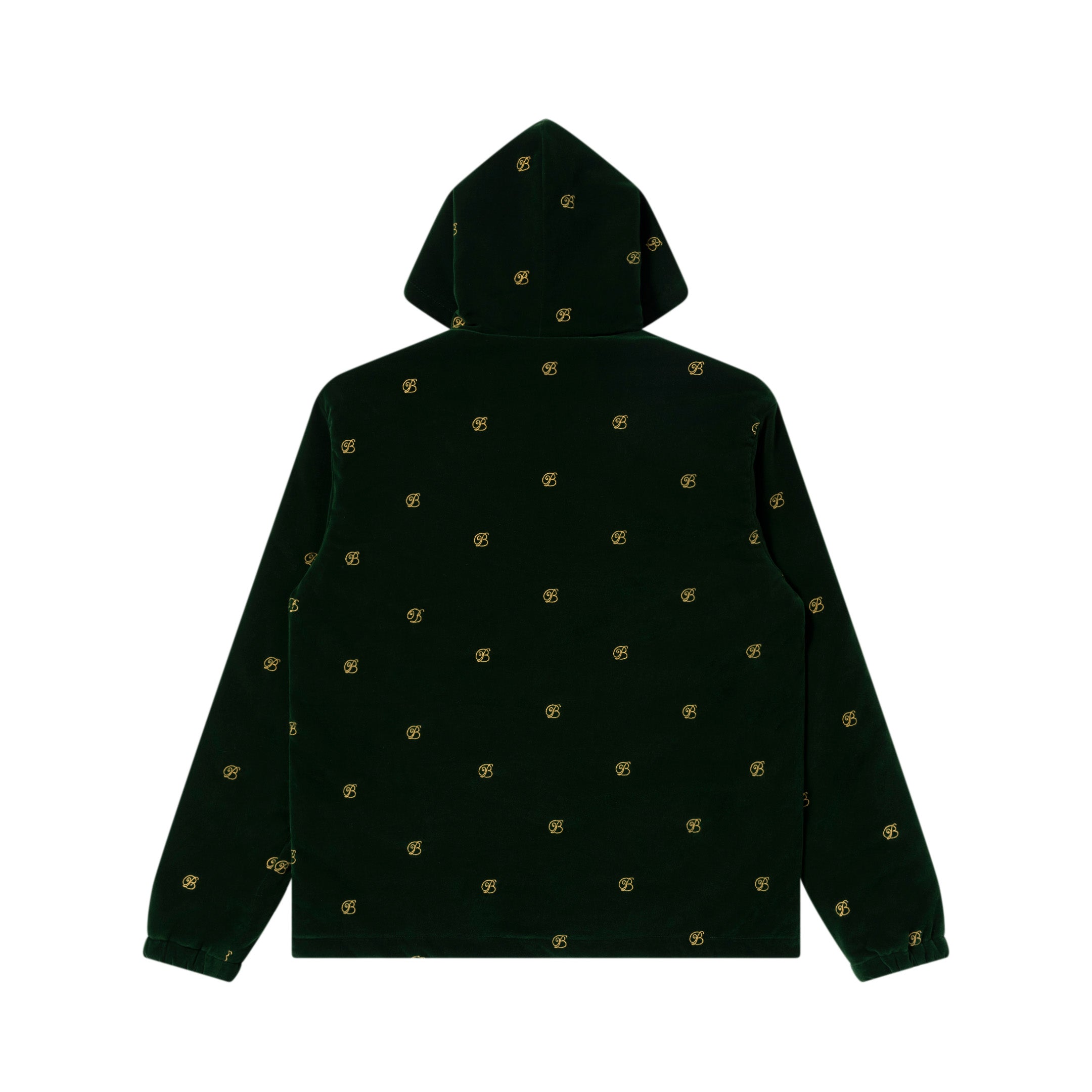 "B EMBLEM" のロゴ刺繍を全面に施して総柄を表現したジップフードジャケット。