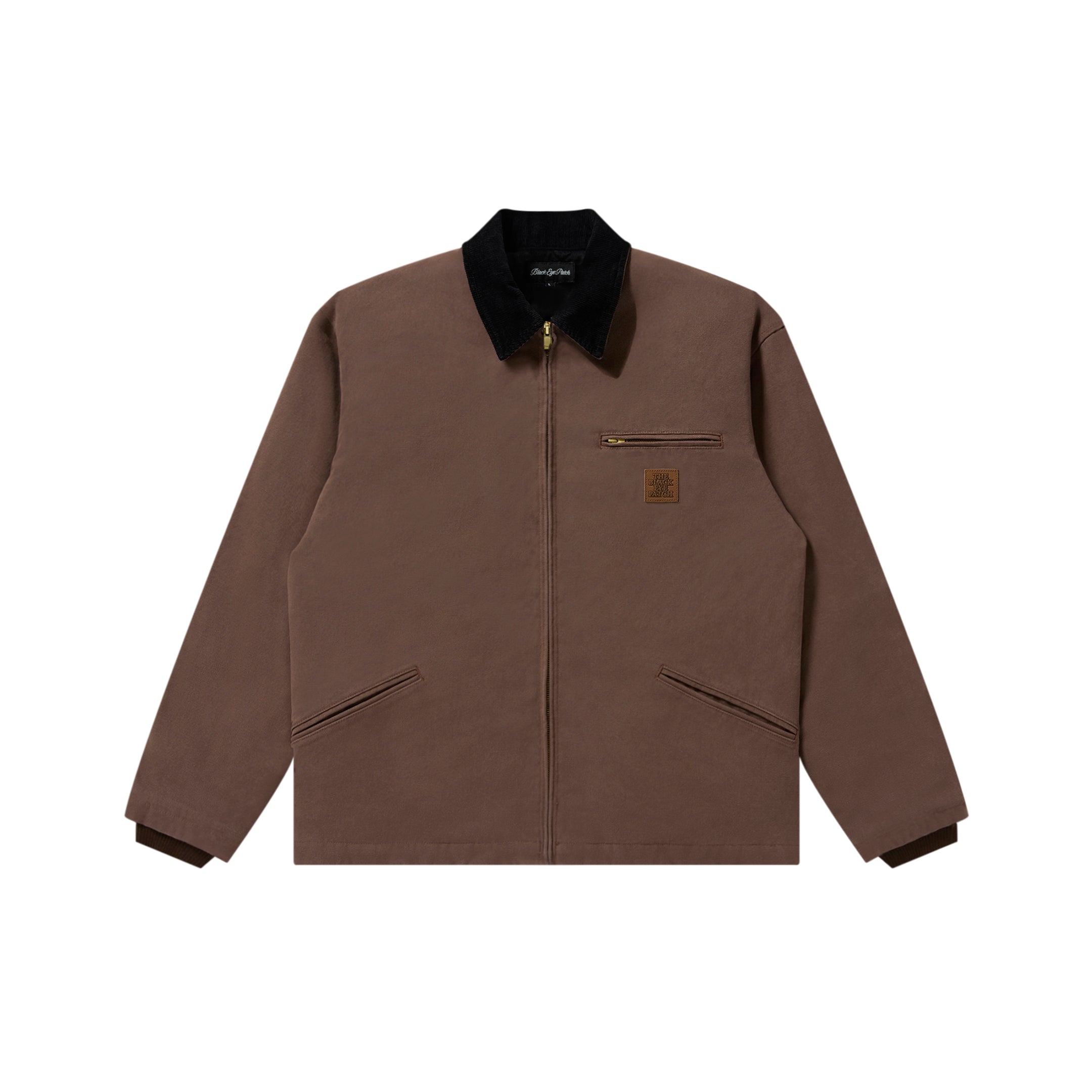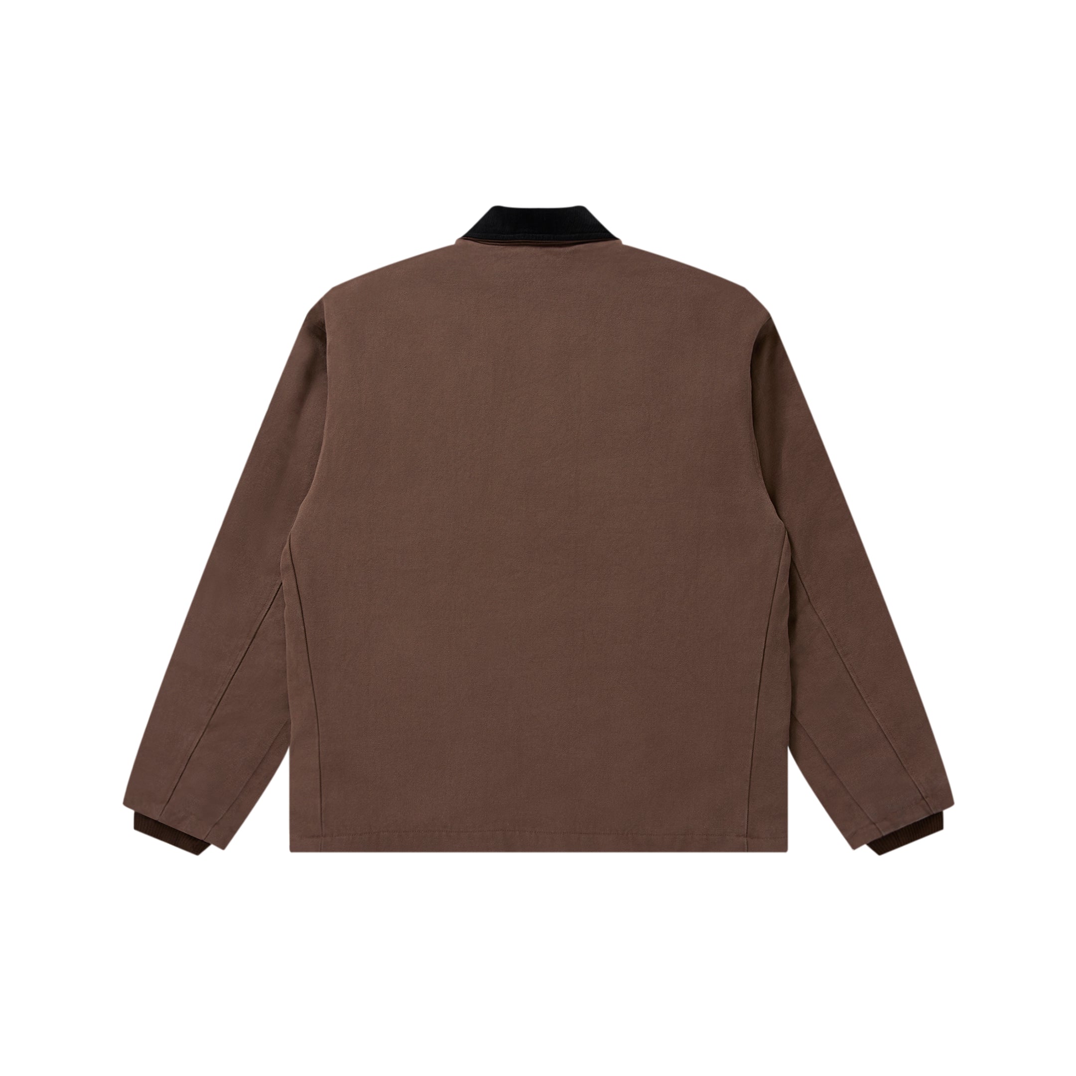 A heavy-weight work jacket made from 18oz duck fabric featuring a washed finish. The collar features corduroy fabric, with a square "OG LABEL" leather patch positioned on the chest. The lining is quilted with padding.