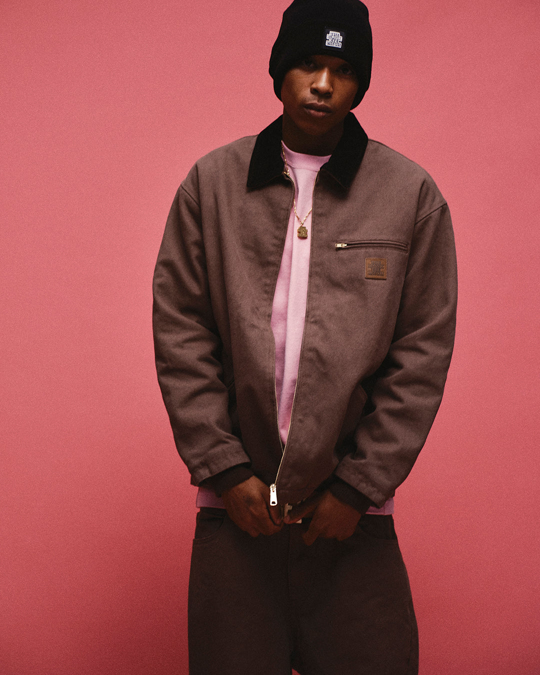 襟にはコーデュロイ生地を使用し、胸元にスクエア型の "OG LABEL" レザーワッペンを配置。