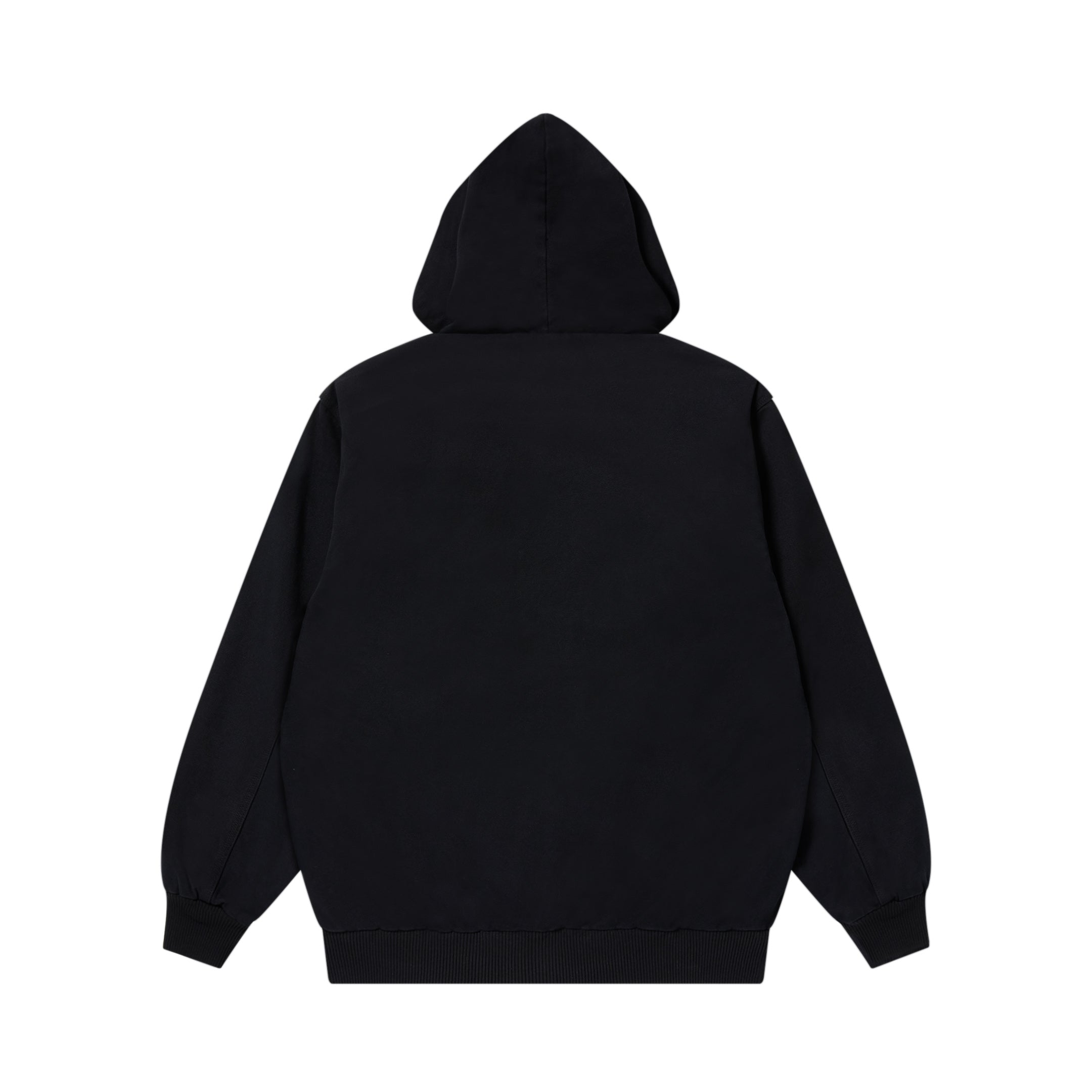 Hooded jacket made from washed duck fabric featuring a leather patch on the front.