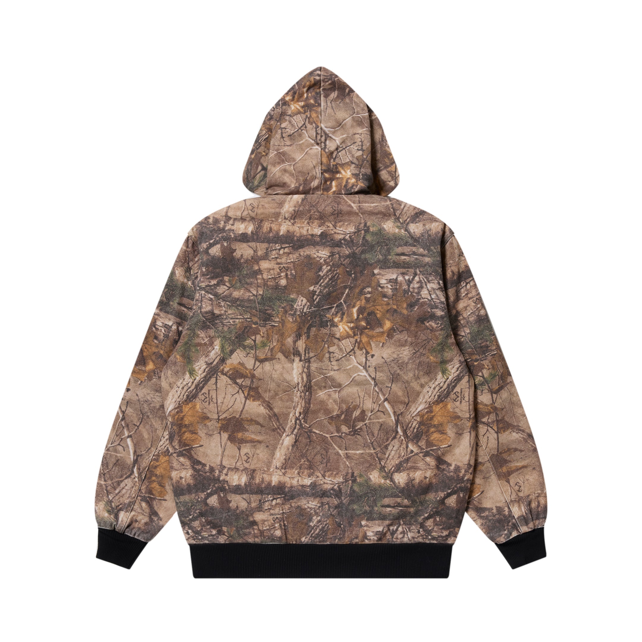 Hooded jacket made from washed duck fabric featuring a leather patch on the front.