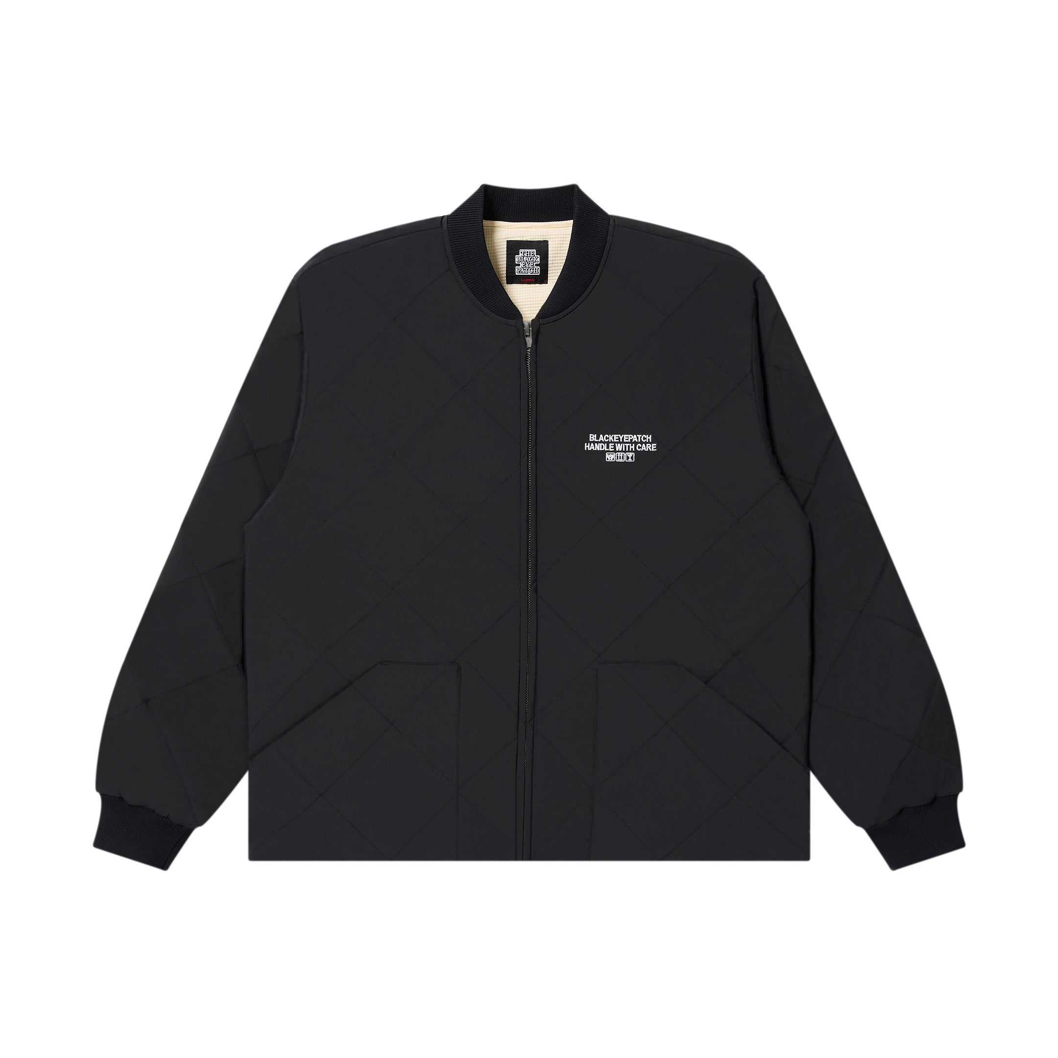 Quilted jacket featuring “Handle with Care” embroidered on the back. Available in two colors: black and woodland camo.
