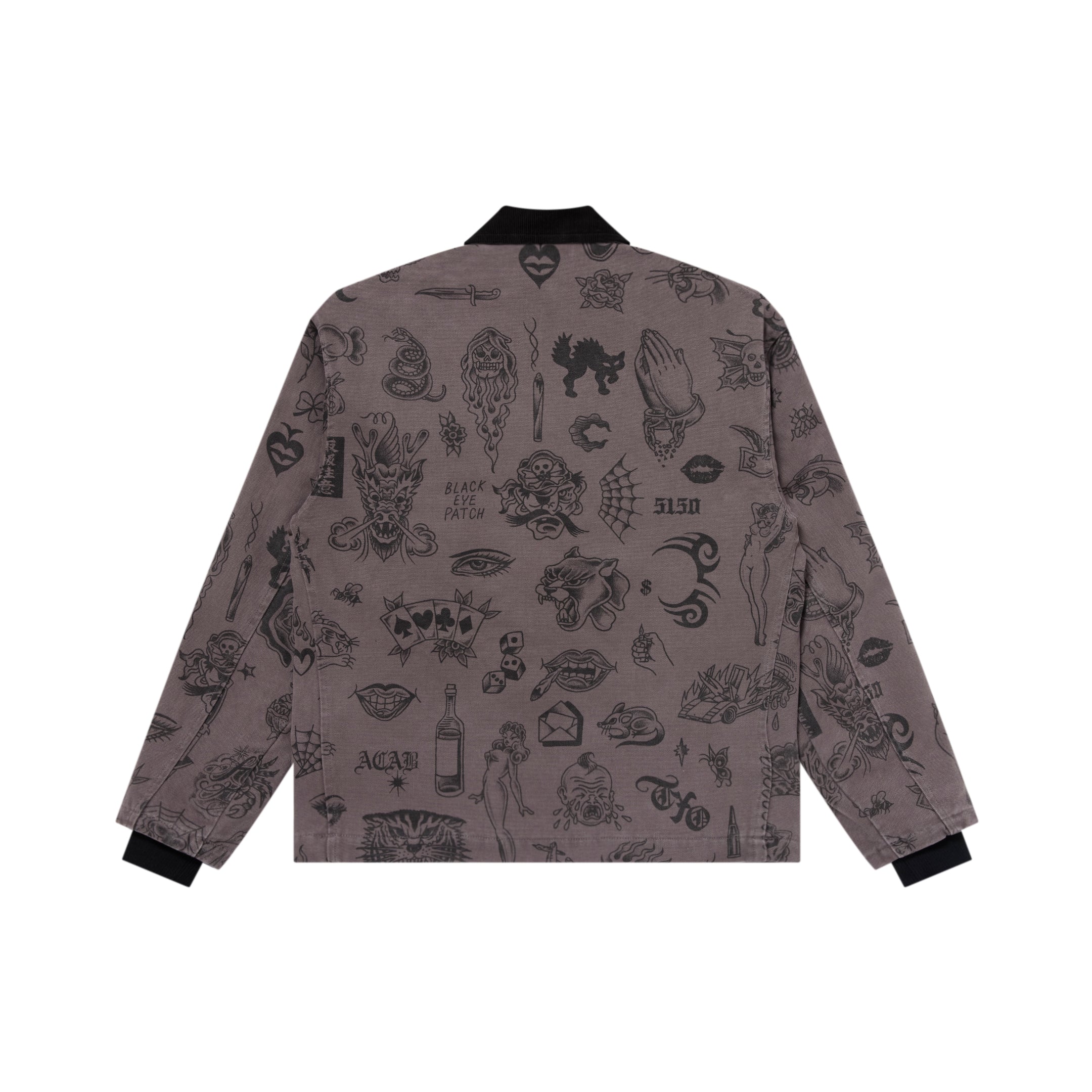 タトゥーアーティストの UE 氏のグラフィックがプリントされたダック生地ワークジャケット。