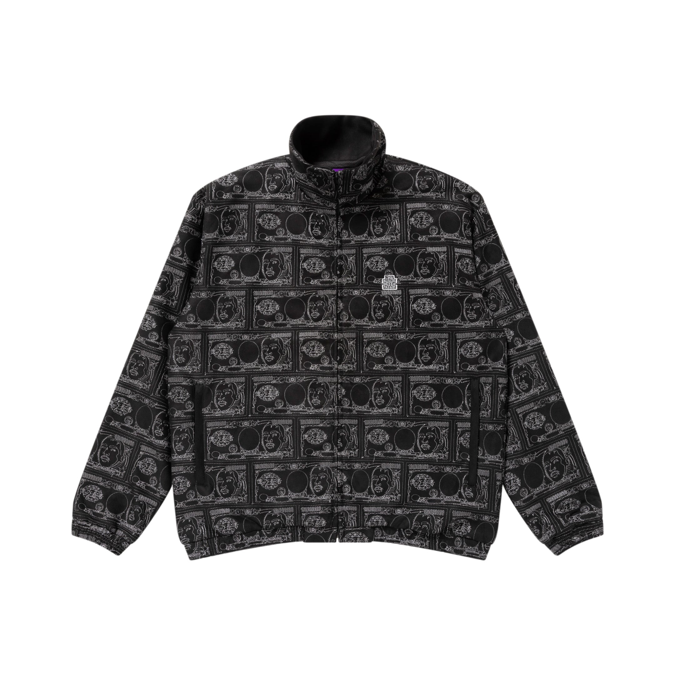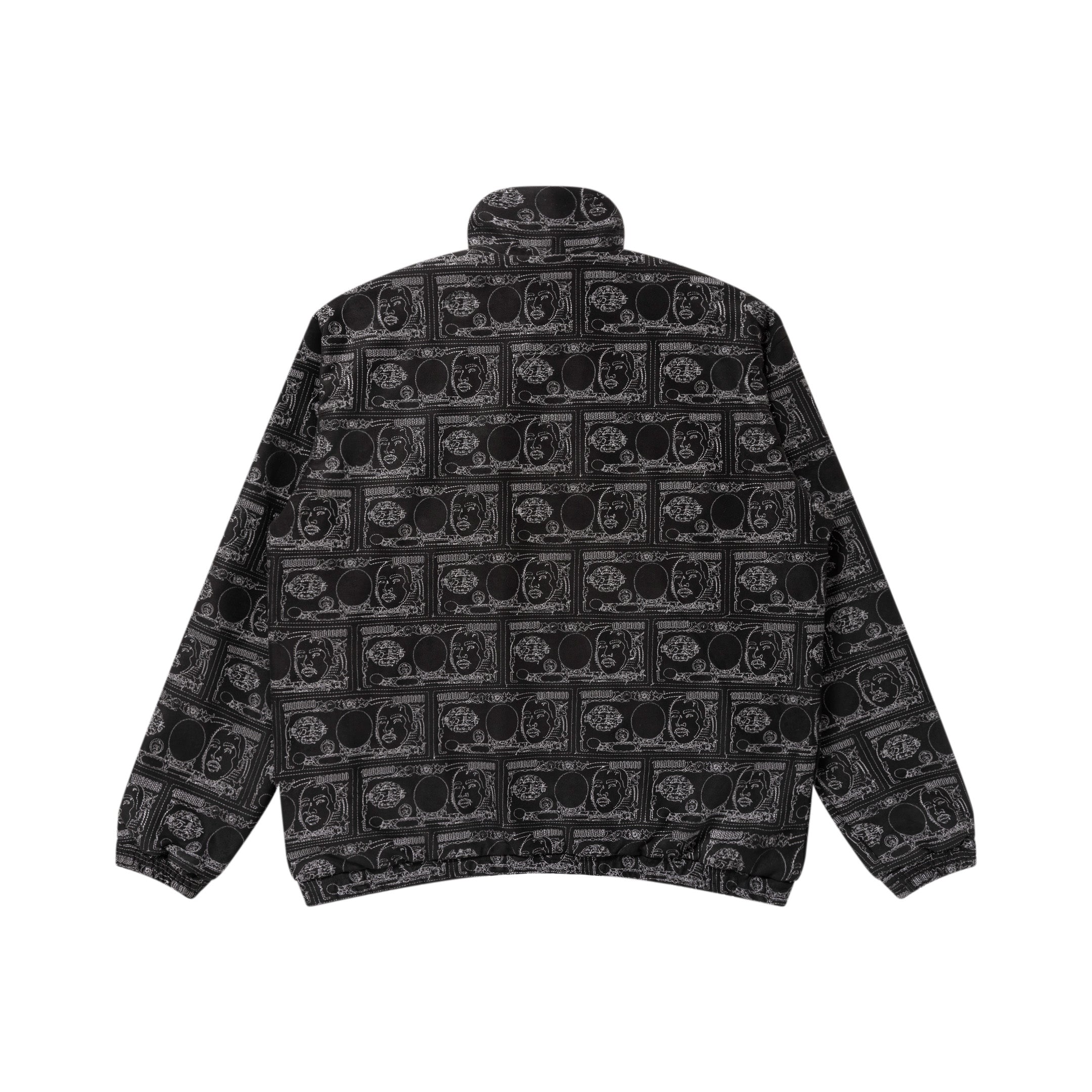 Yuki Chiba の肖像画を落とし込んだ 1 億円札デザインの総柄刺繍を施したフェイクスエードのトラックジャケット。
