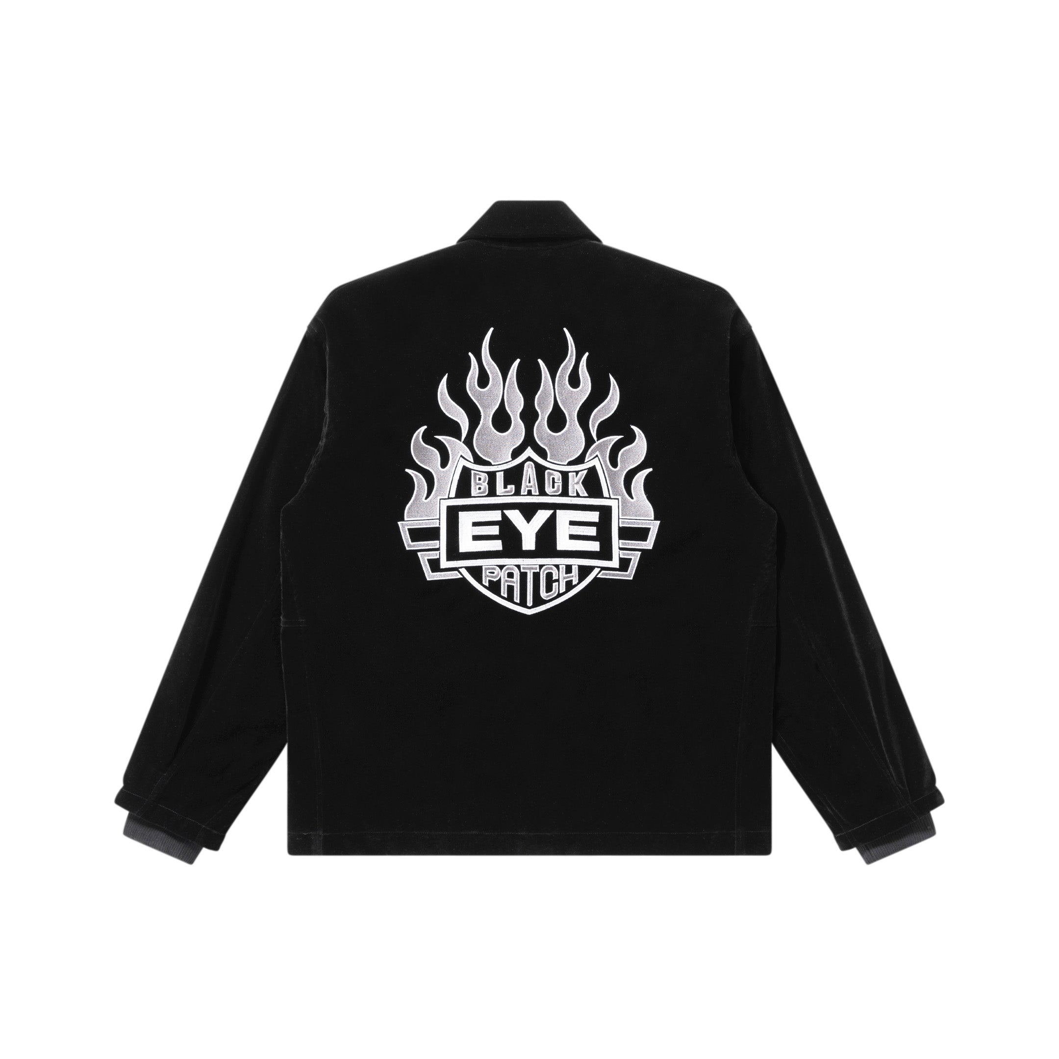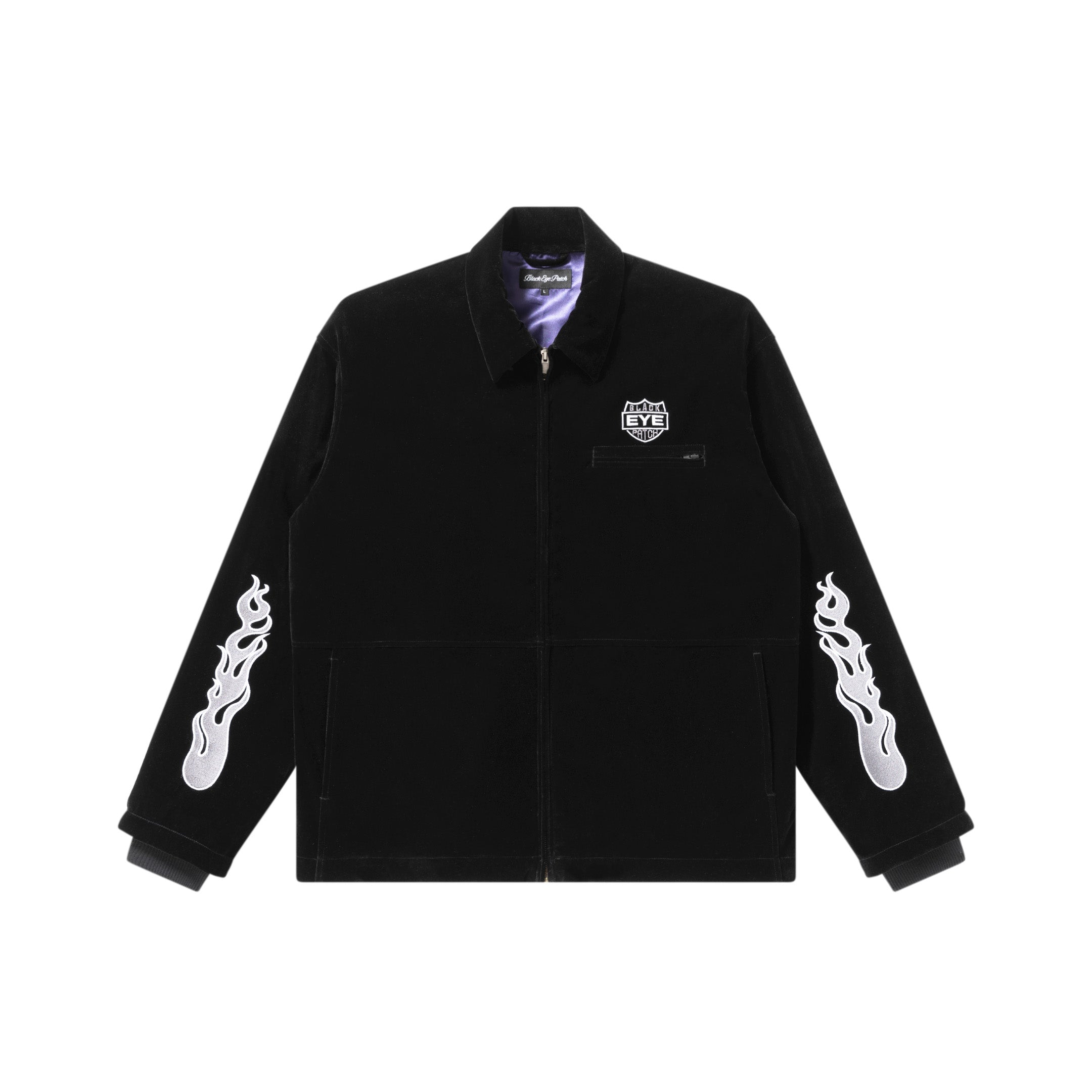 Velour fabric work jacket featuring graphics inspired by the leading American motorcycle manufacturer on the front and back, and embroidered fire patterns on the sleeves. The lining is quilted with wisteria-colored fabric.