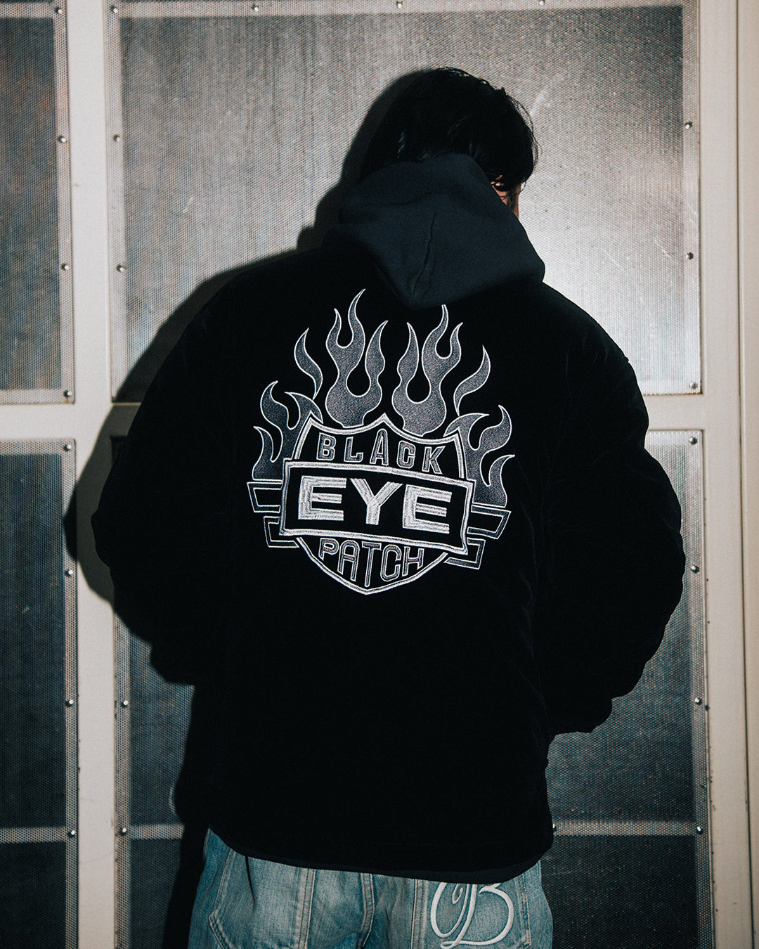 アメリカを代表するバイクメーカーからインスパイアされたグラフィックがフロント・バックに、袖にはファイヤーパターンが刺繍で施されたベロア生地のワークジャケット。