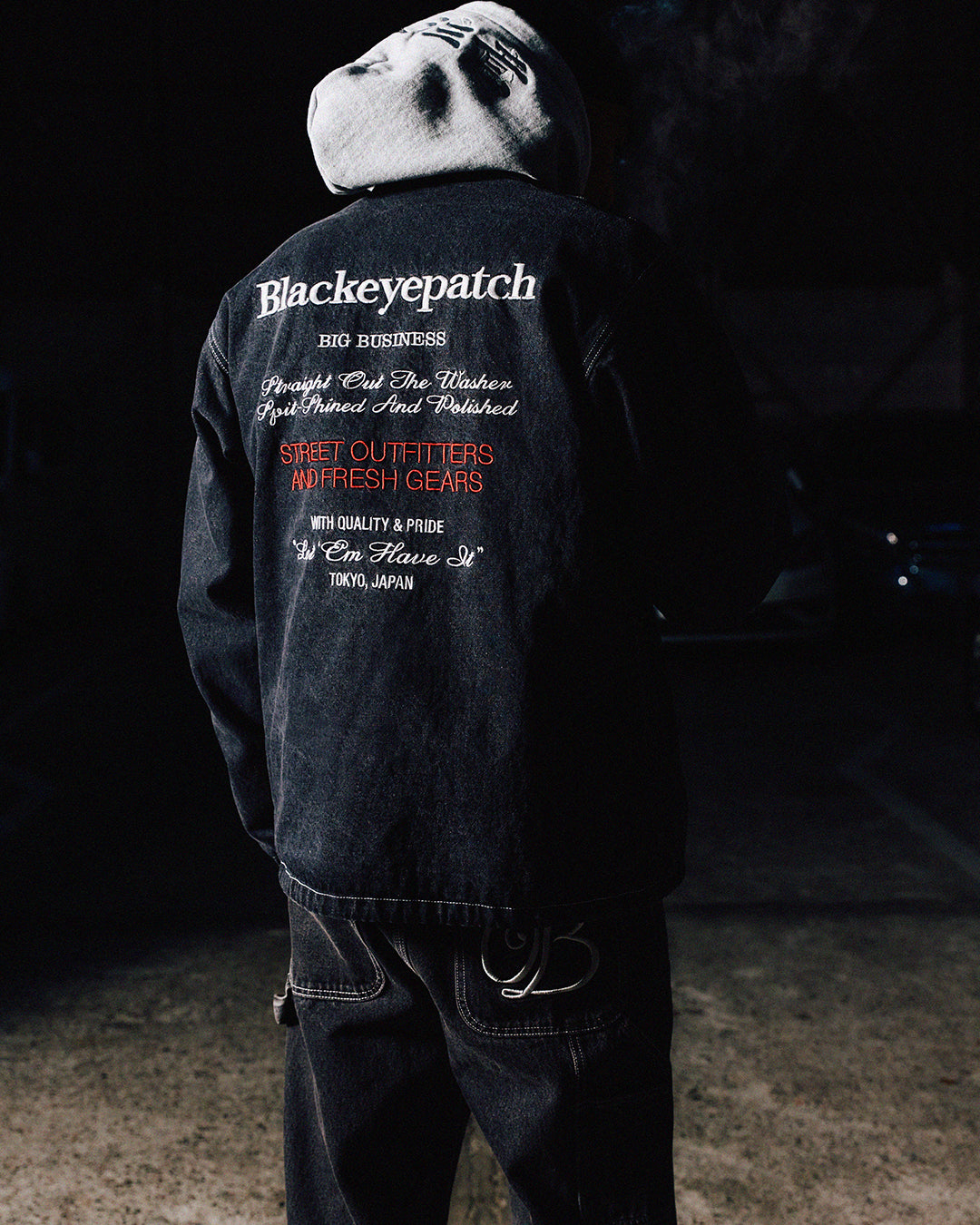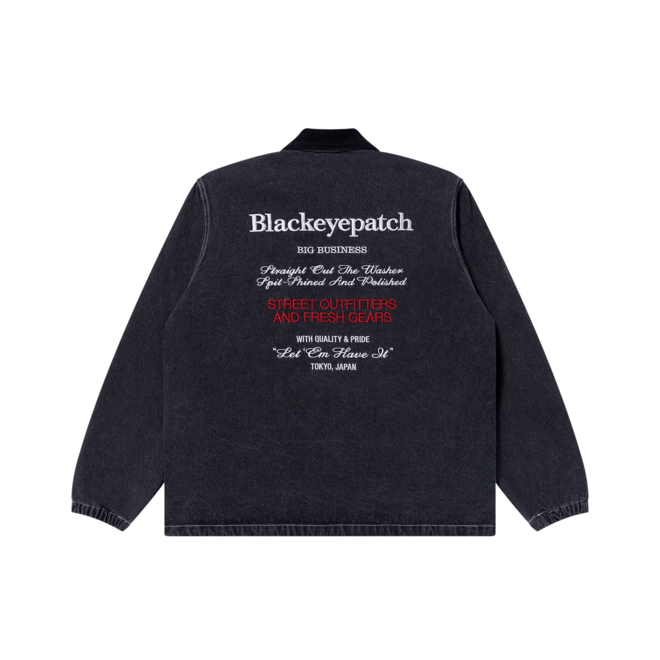 BEP のステートメントを表す "BIG BUSINESS" グラフィックを両面に刺繍で施したデニム地のコーチジャケット。
