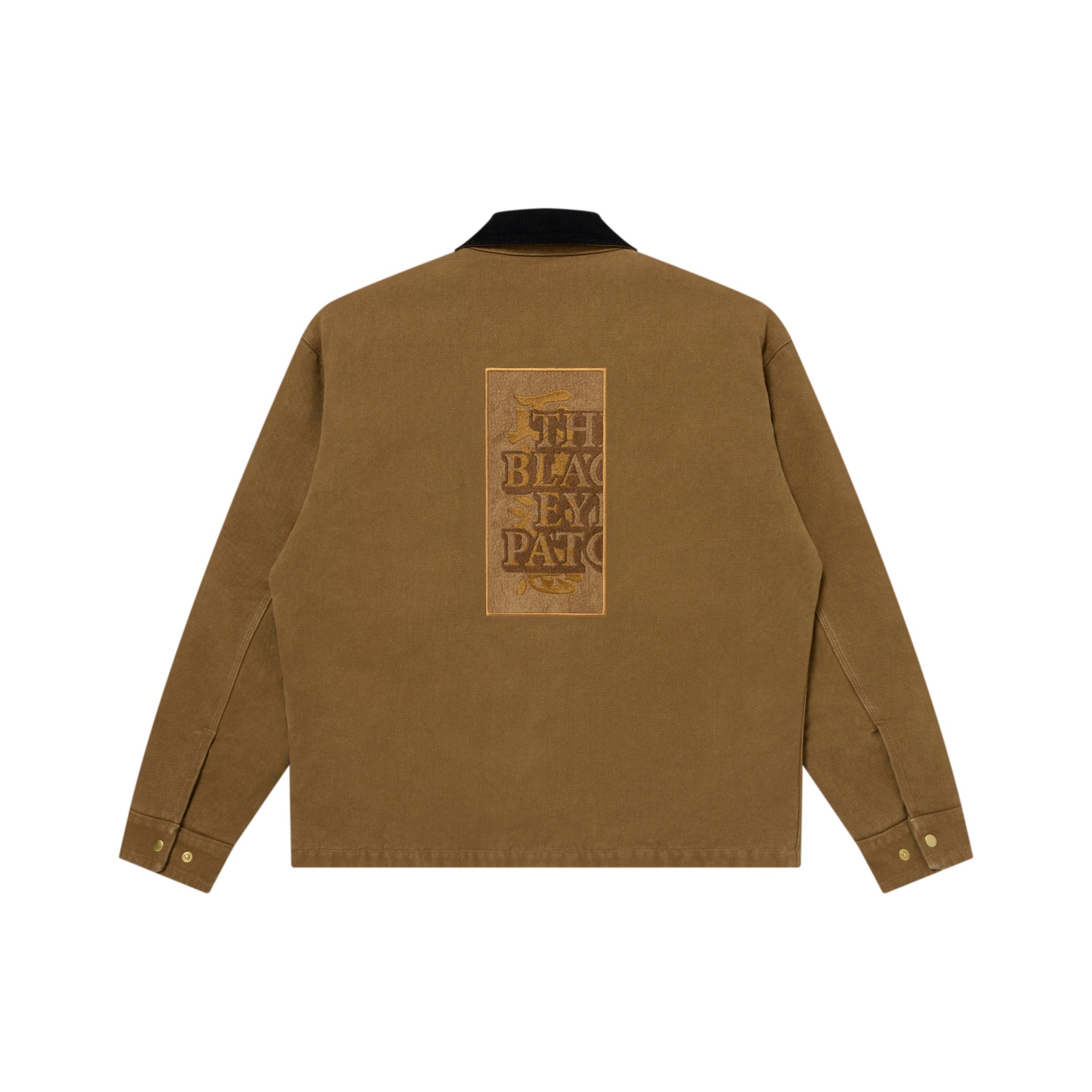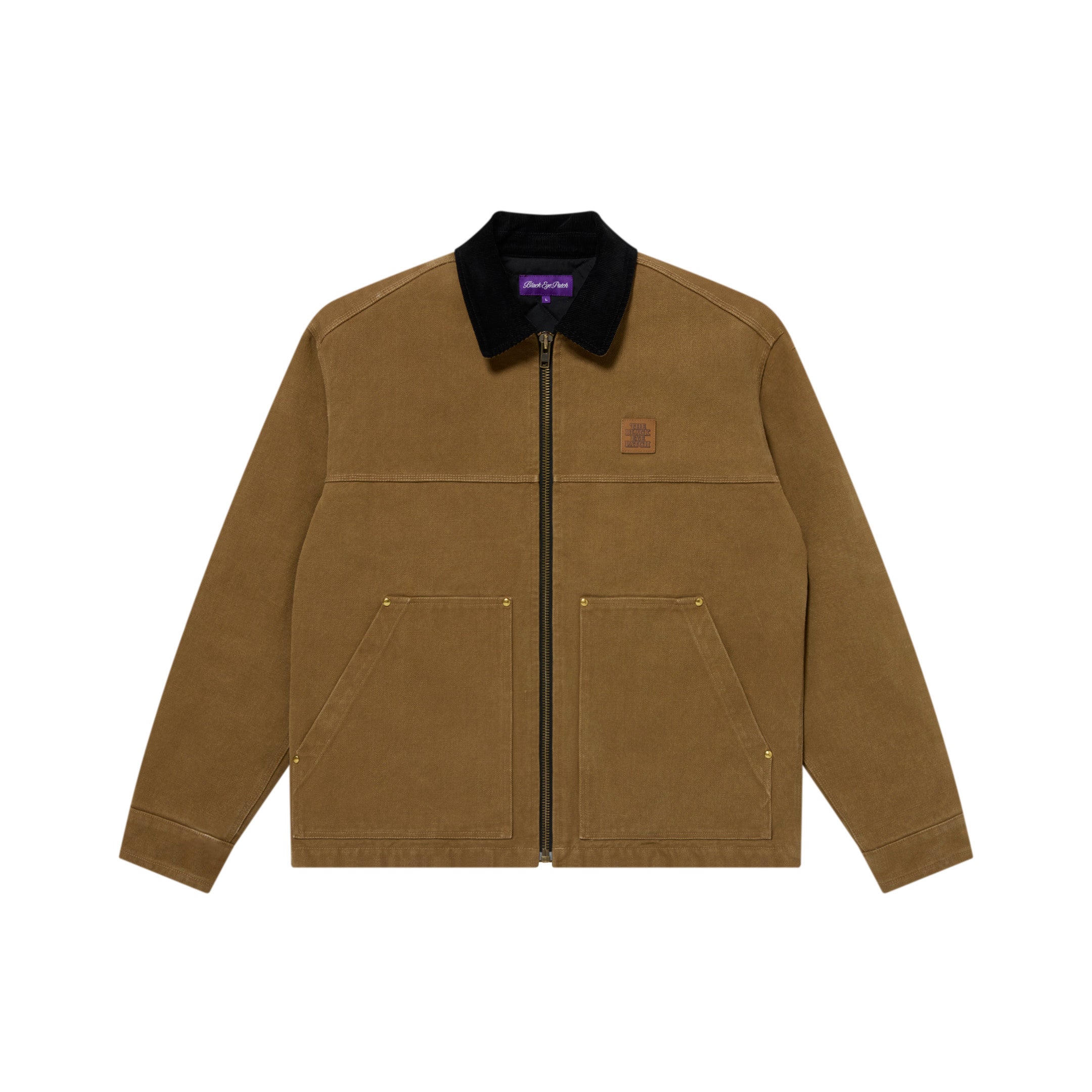 Work jacket crafted from washed duck fabric. Features a corduroy collar and a square “OG LABEL” leather patch on the chest. The back showcases a "Handle with Care" label logo embroidered in a color matching the body.