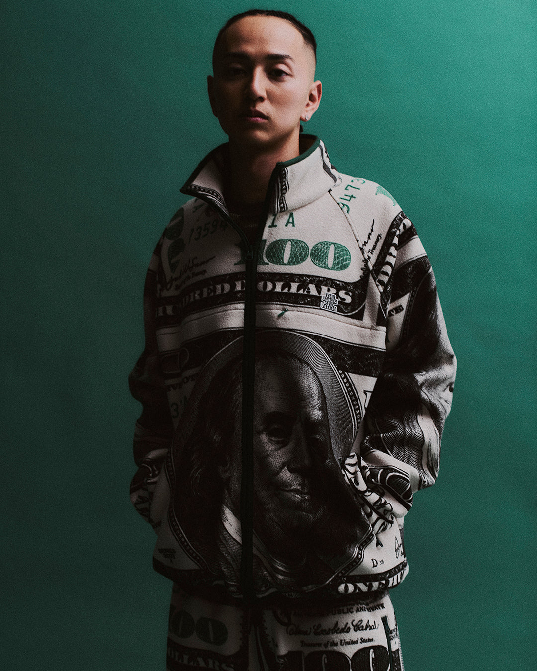 マイクロフリースに 100 ドル札を全面に総柄プリントしたジャケット。