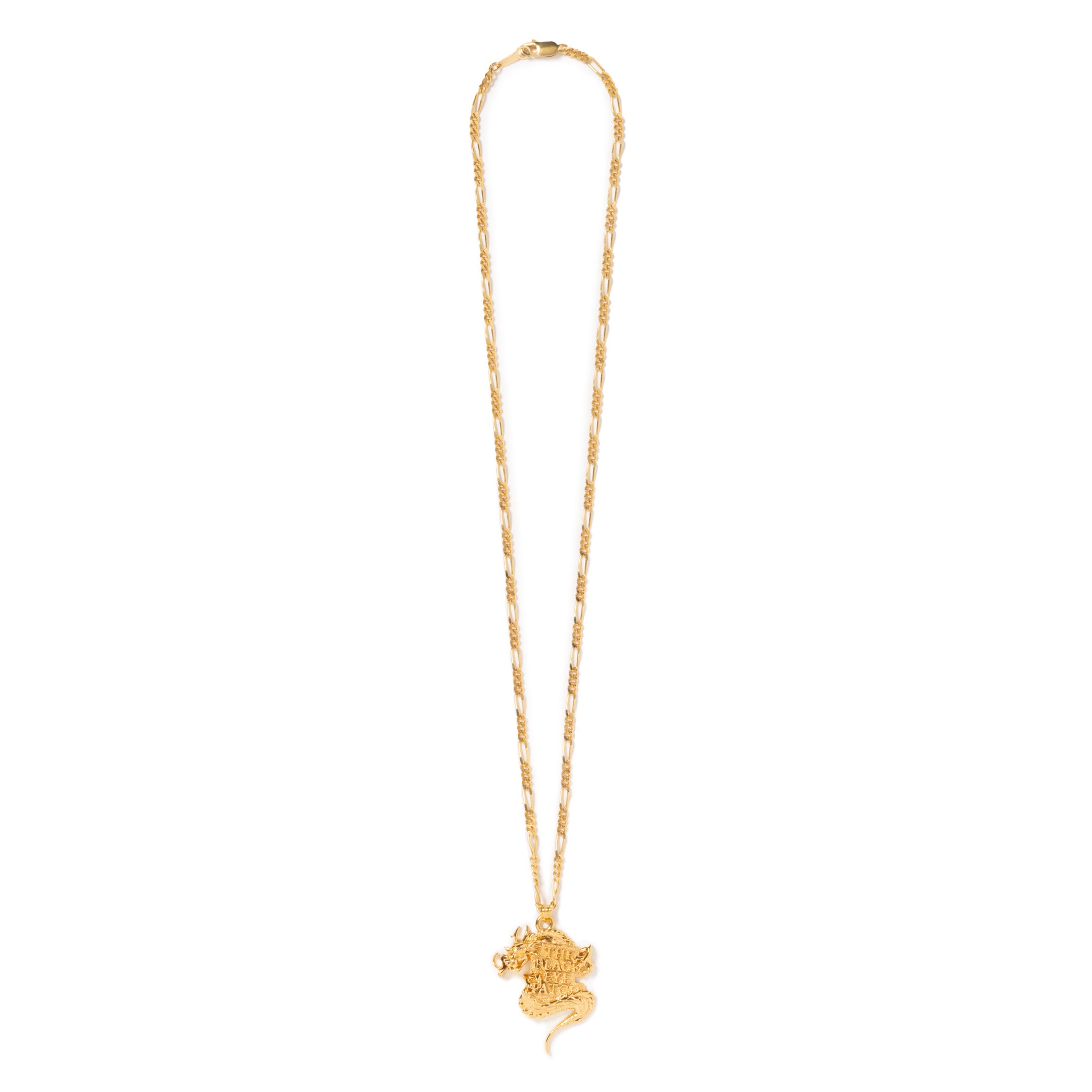 Pendant top in the shape of a graphic of a dragon holding the "OG LABEL" and the necklace has a luxurious finish with a Figaro chain attached. Gold-plated with a 925 silver base.