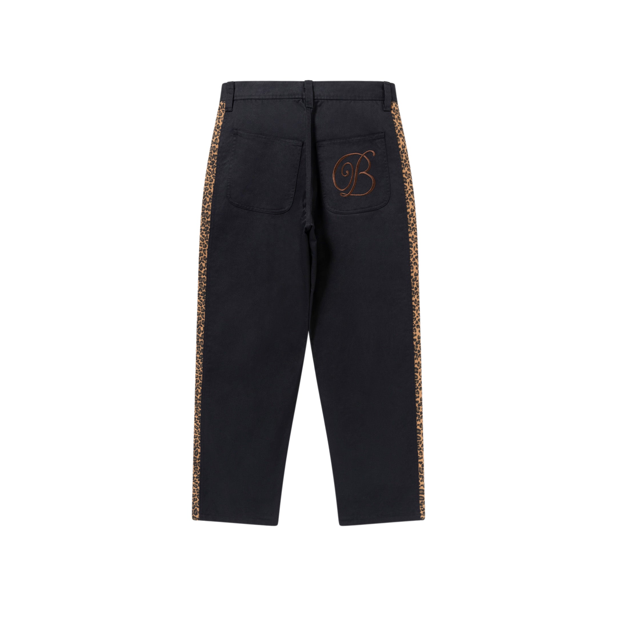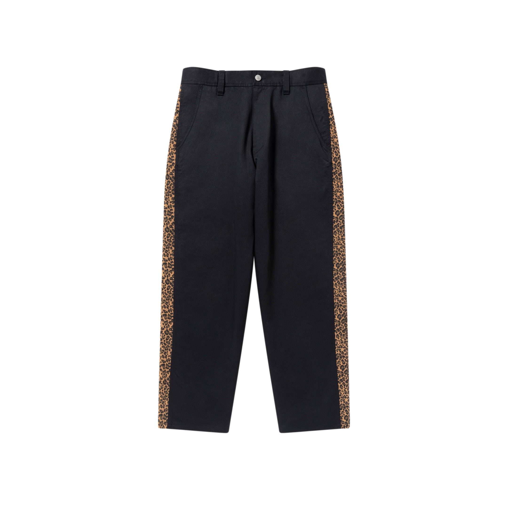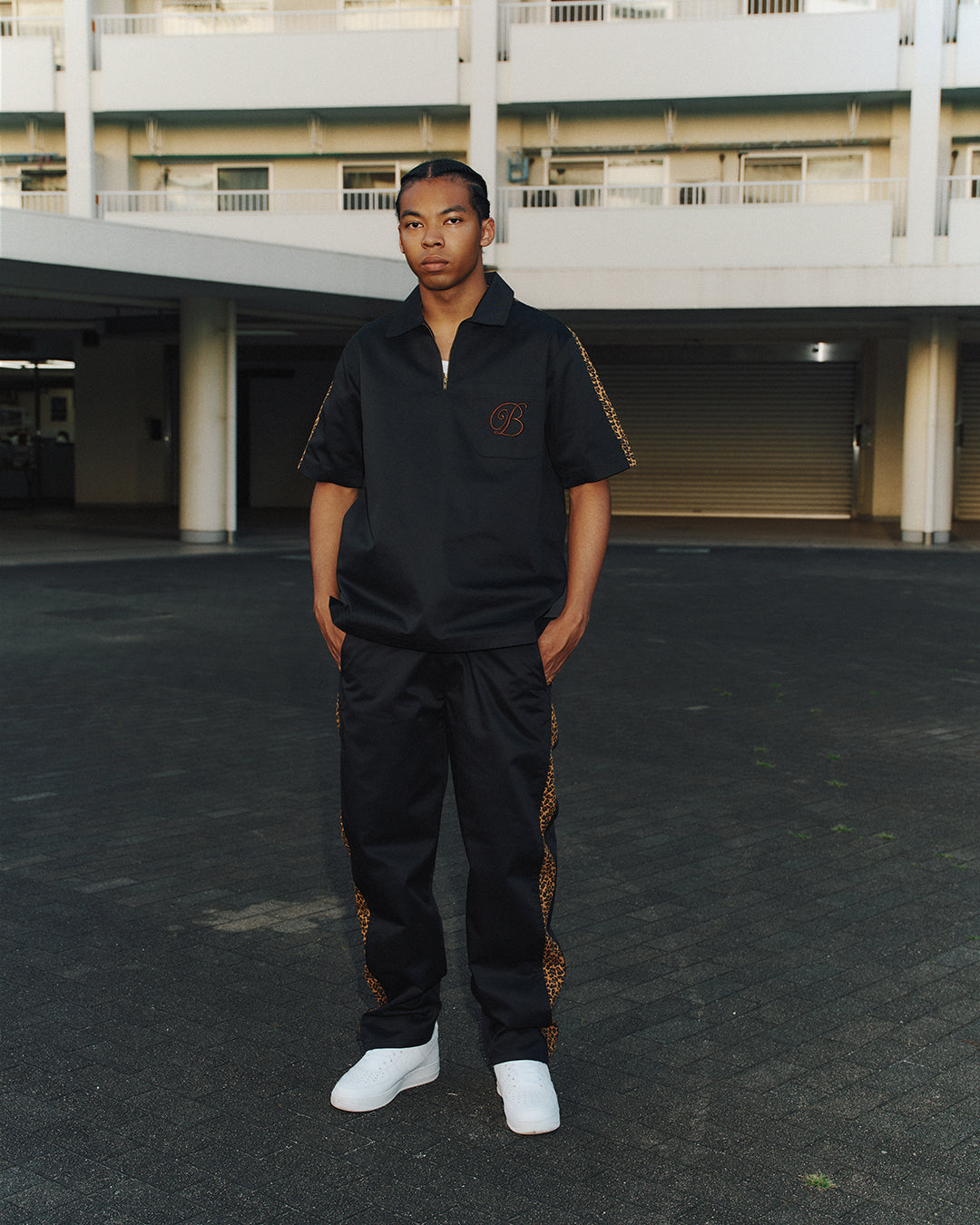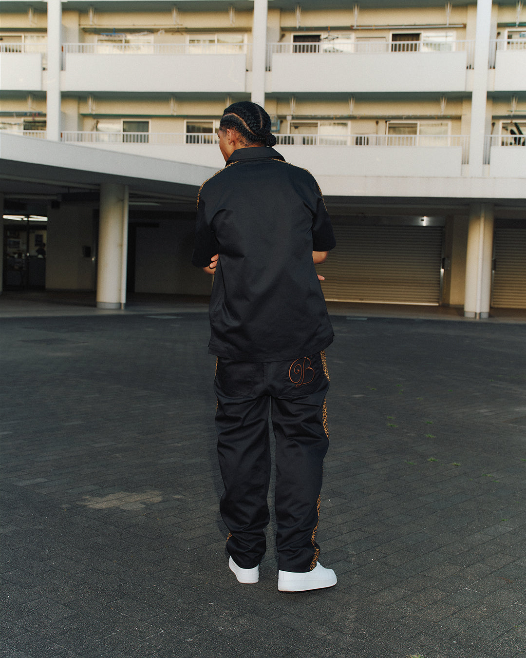 Work pants featuring polyurethane embroidery of the "B EMBLEM" logo on the back pocket. Leopard pattern tape runs along the sides. Made with a polyester and cotton blend twill fabric. The matching shirt, designed in the same style, can be worn as a set.