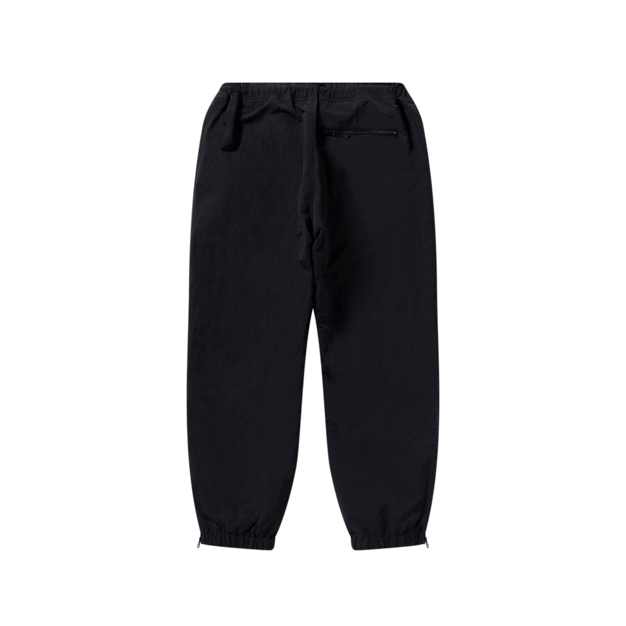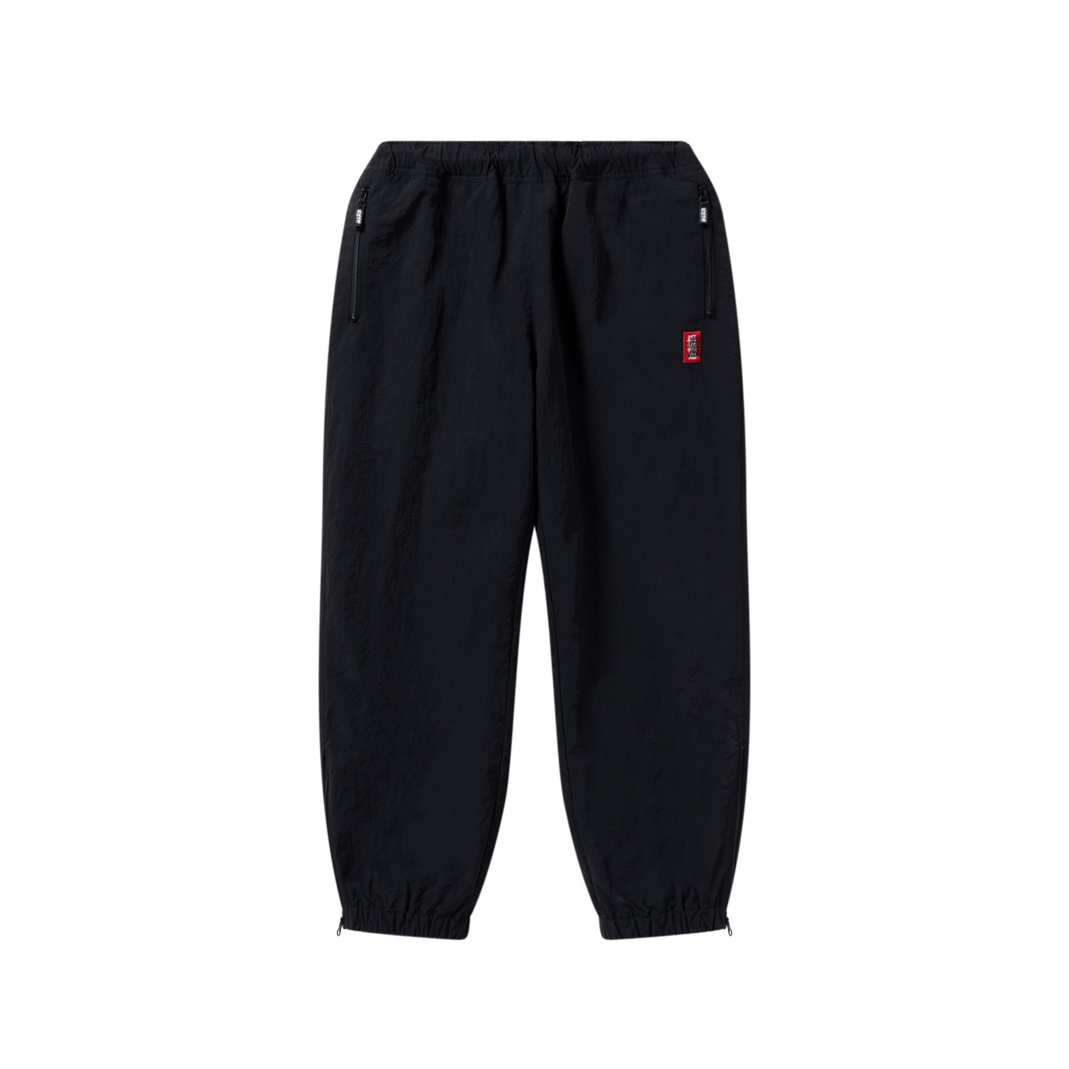 左腿に "取扱注意" LABEL ロゴグラフィックのスモールワッペンを配置したシャリ感あるナイロン素材を使用したトラックパンツ。