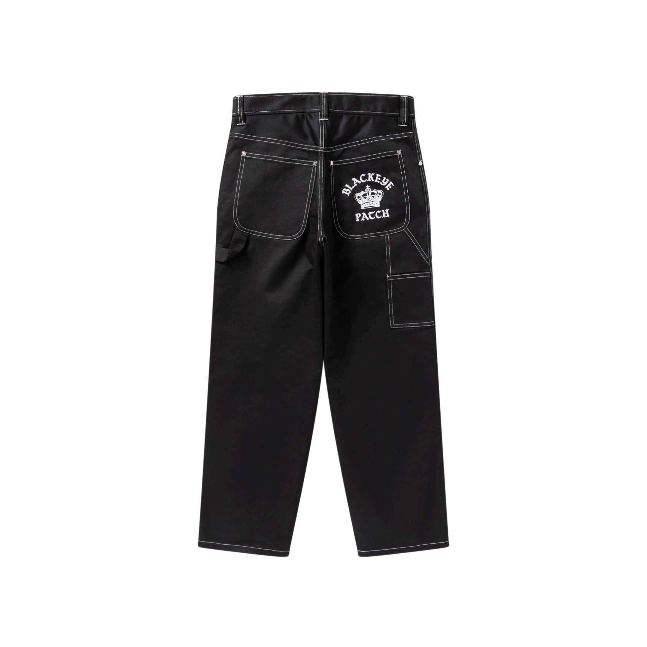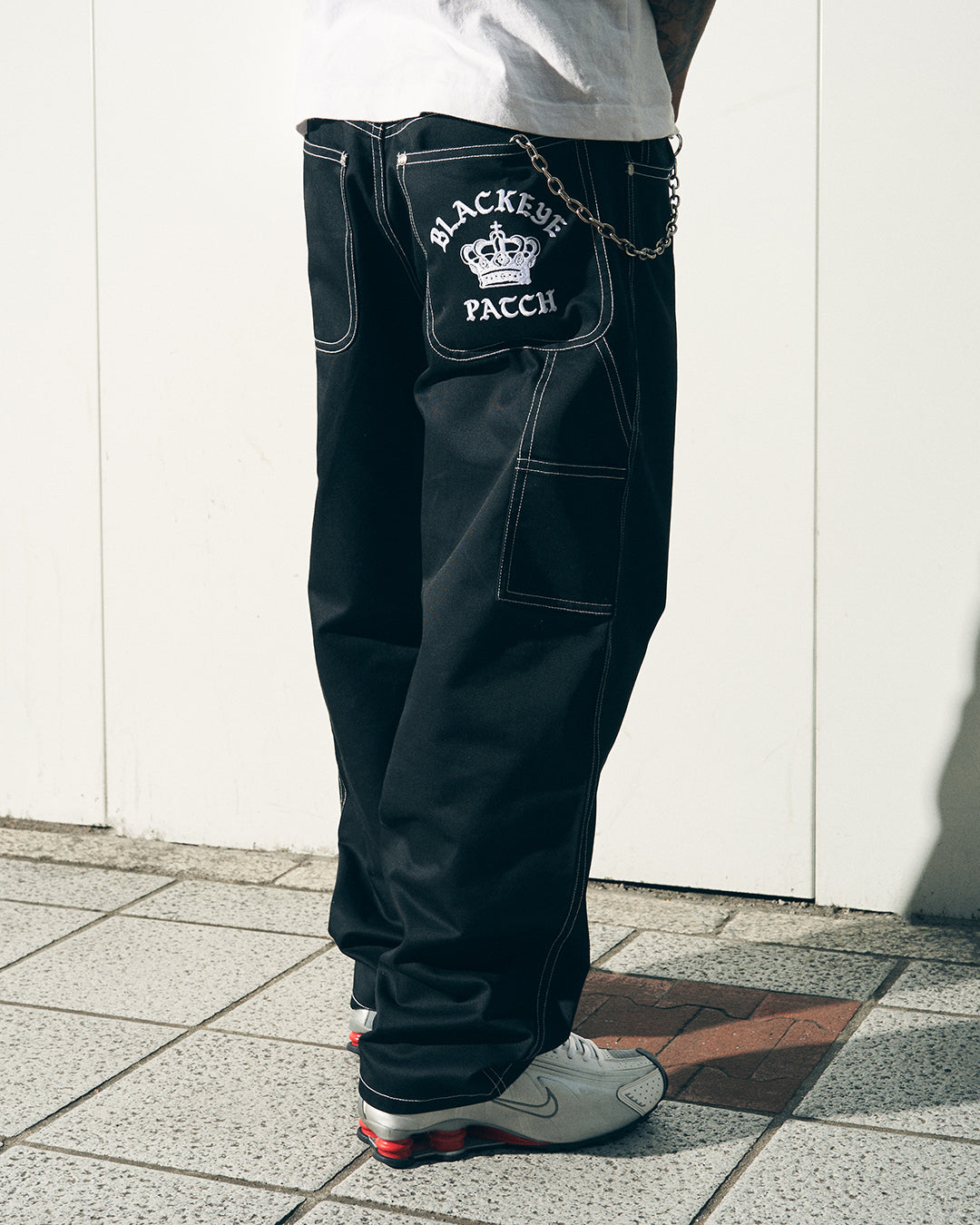 2000 年代初頭の US ストリートカルチャーの雰囲気を感じさせるグラフィックをバックポケットに刺繍したツイル生地を使用したペインターパンツ。