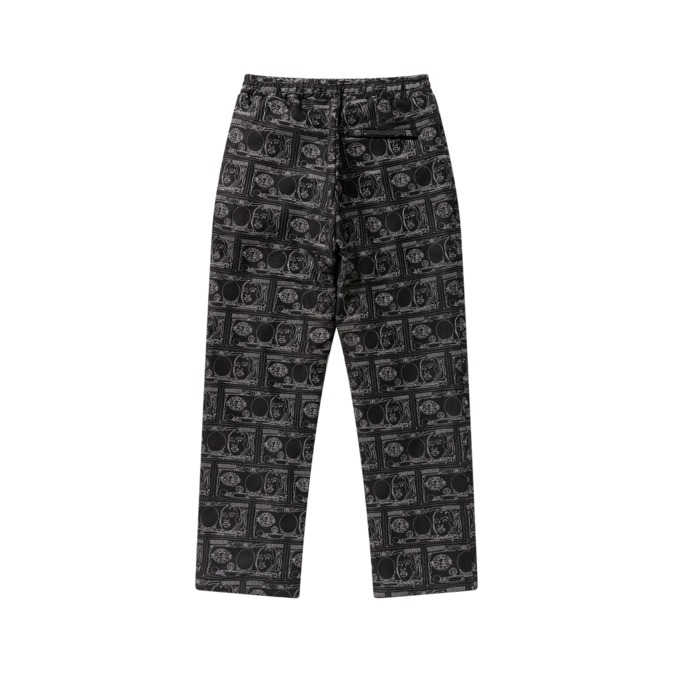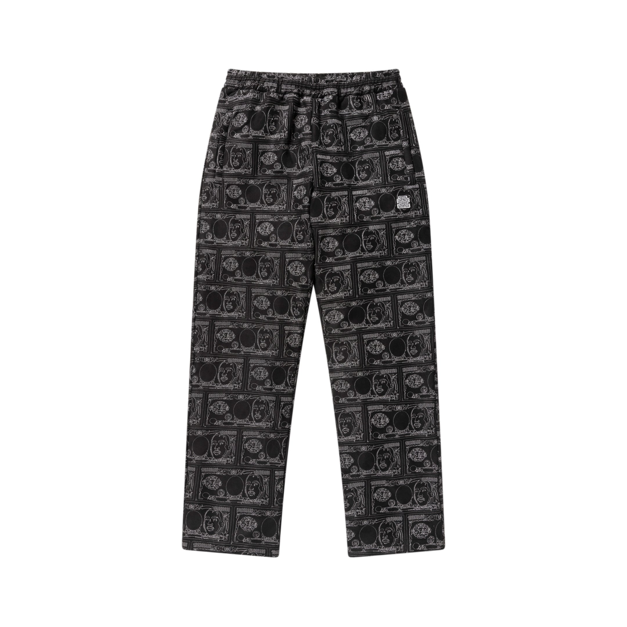 Yuki Chiba の肖像画を落とし込んだ 1 億円札デザインの総柄刺繍を施したフェイクスエードのトラックパンツ。