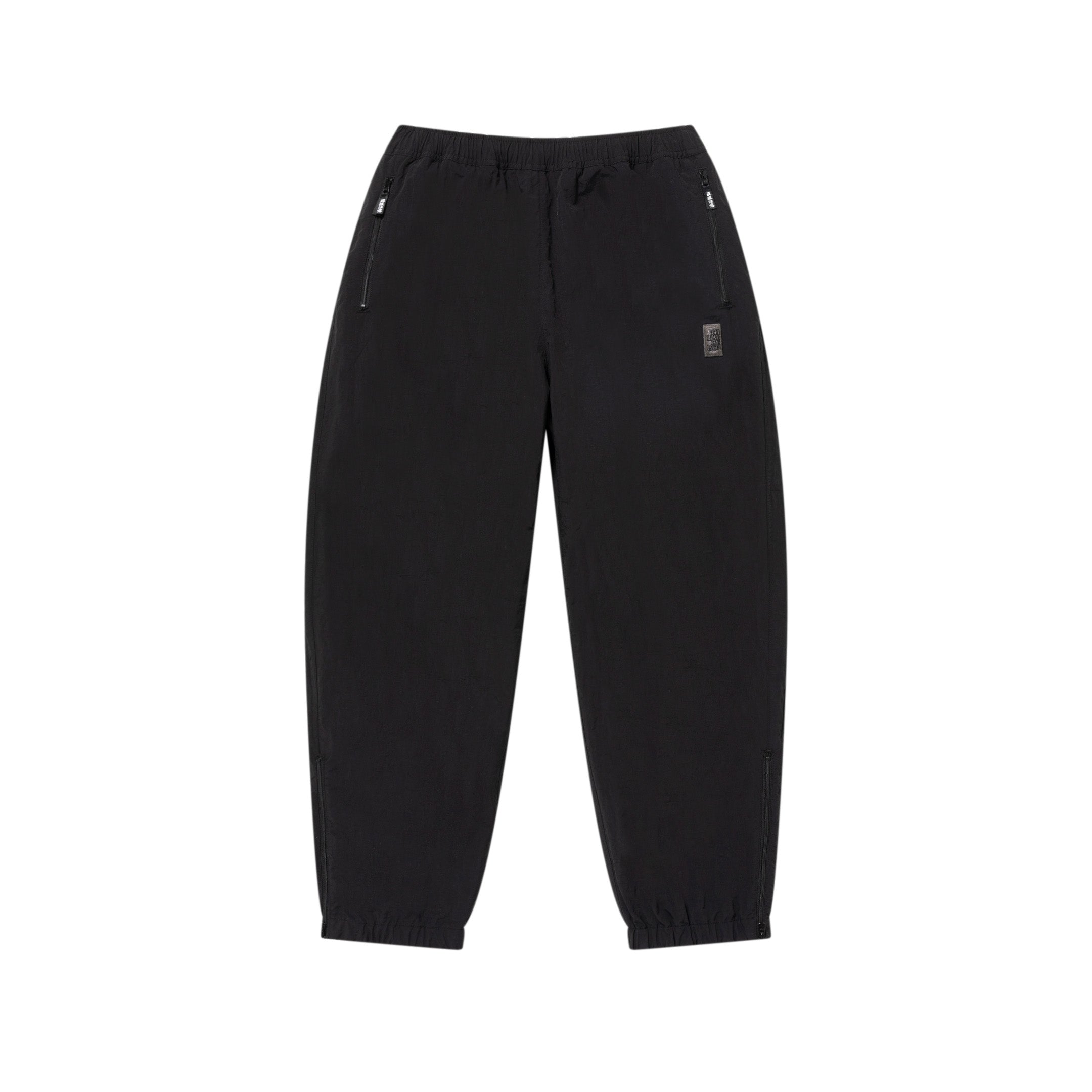 左腿にボディと同系色の "取扱注意" ラベルロゴ・スモールワッペンを配置したトラックパンツ。